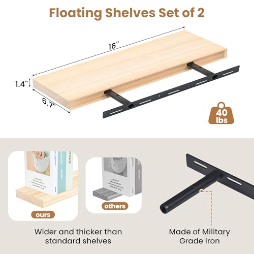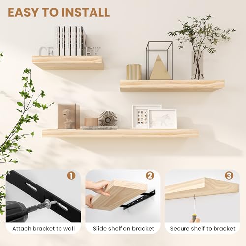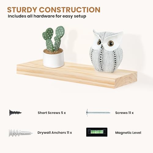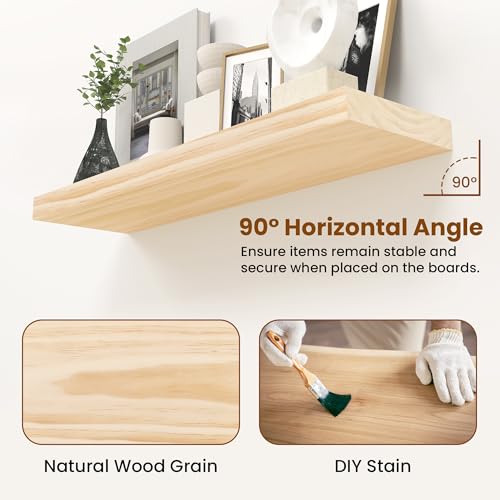 Fun Memories Wood Floating Shelves Set of 2, Rustic Pine Wood Floating Shelves for Wall Mounting, Wide Wall Shelves for Home Decor and Storage, 24" W x 6.7" D, Natural Unfinished, DIY Stain