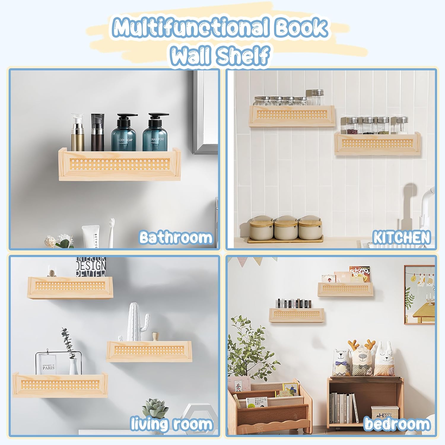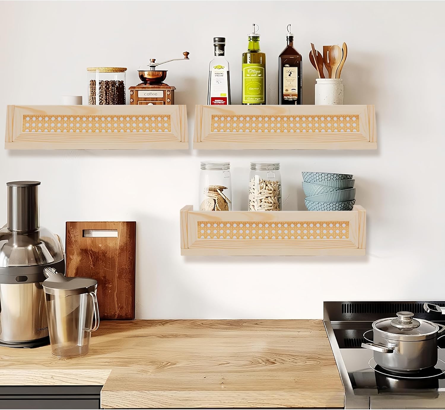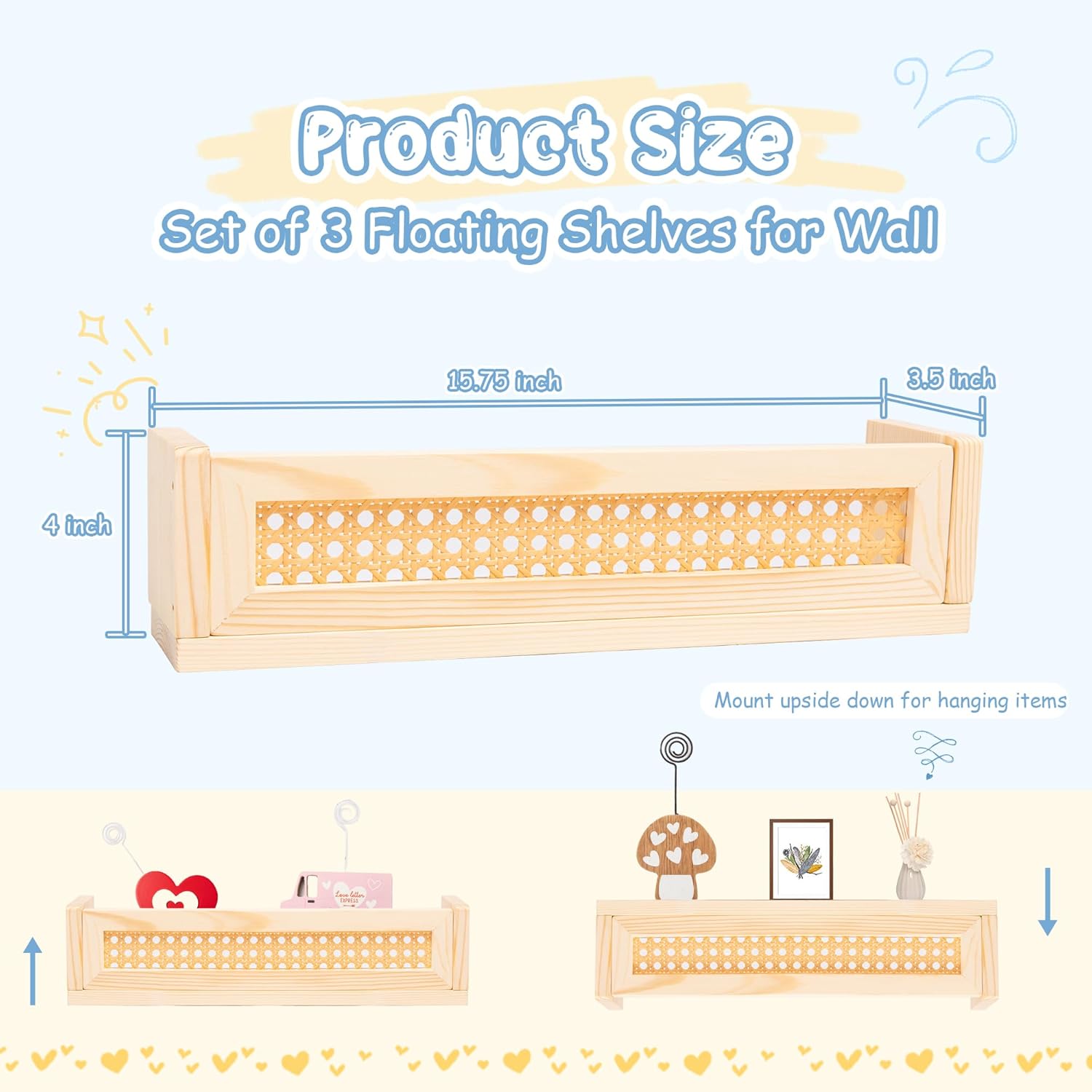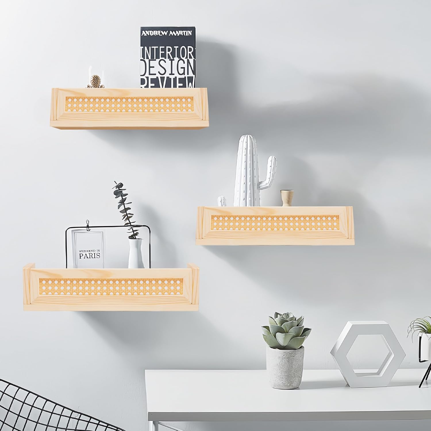 Defined Deco 16” Rattan Shelf Set of 3 for Wall Decor, Boho Rattan Bookshelves Wood Hanging Floating Shelves for Kids Room, Baby Bookcase for Nursery, Hanging Bookshelves for Playroom, Bedroom Decor