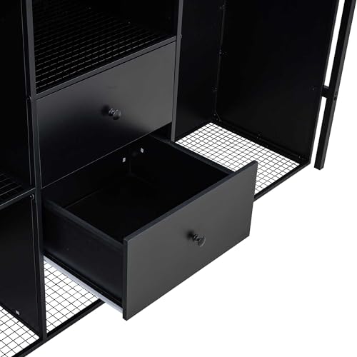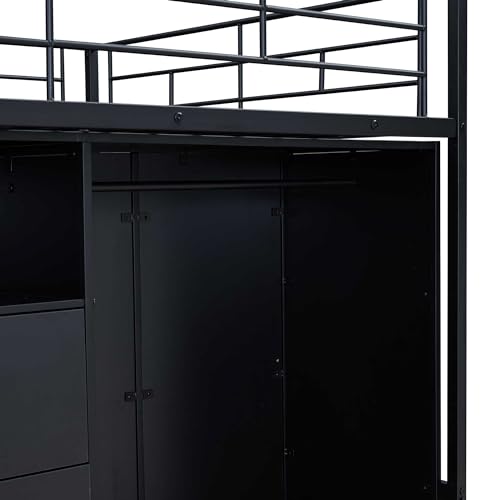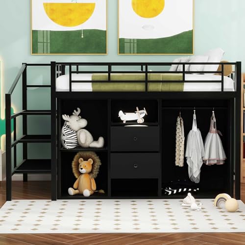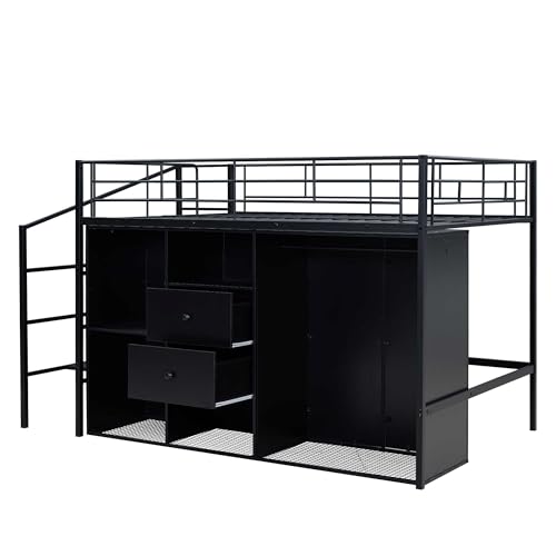 SOFTSEA Full Size Metal Loft Bed with Drawers and Wardrobe, Low Loft Bed with Storage Staircase for Kids, Space Saving Loft Bed for Bedroom Small Room, Black