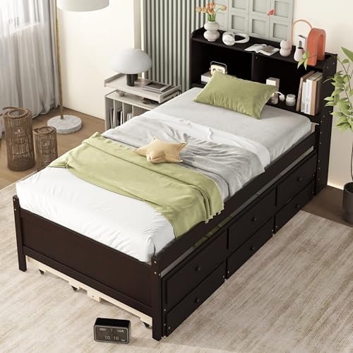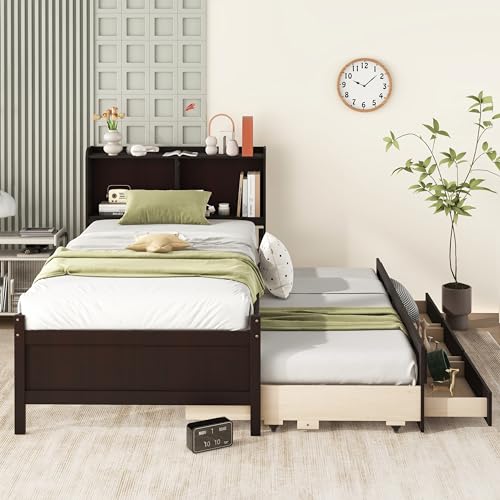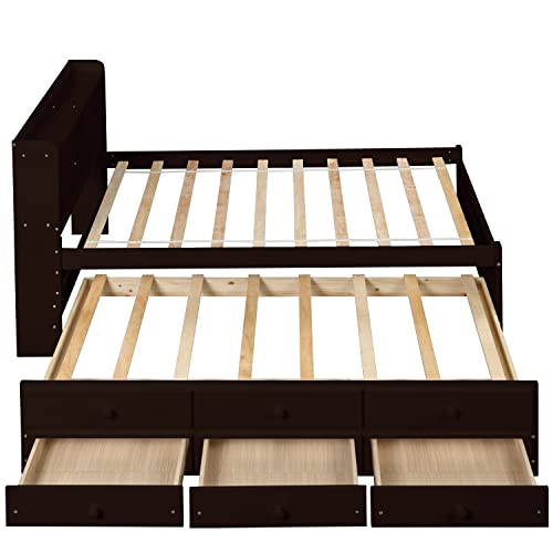 Full Size Bed Frame with Trundle,Captain’s Bed Full with Bookcase Headboard for Kids,Trundle Bed with Storage for Kids,Teens,Adults(Grey)