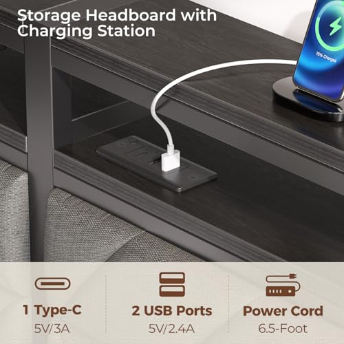 Seventable Bed Frame Full Size with Charging Station, LED Bed with Upholstered Storage Headboard, Metal Platform Bed with Under Bed Storage, No Box Spring Needed, Noise Free, Easy Assembly, Grey