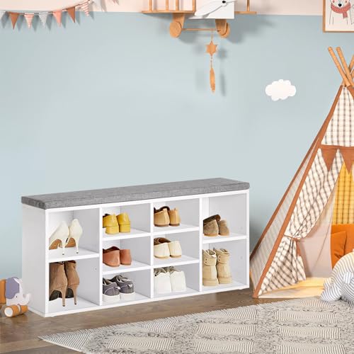 Entryway Shoe Storage Bench 10 Compartments 3-Tier Shoe Organizer with Cushion Functional Cubby Shoe Rack Bench Adjustable Shelves Shoe Shelf Torage Cabinet for Living Room Hallway Mudroom ,White