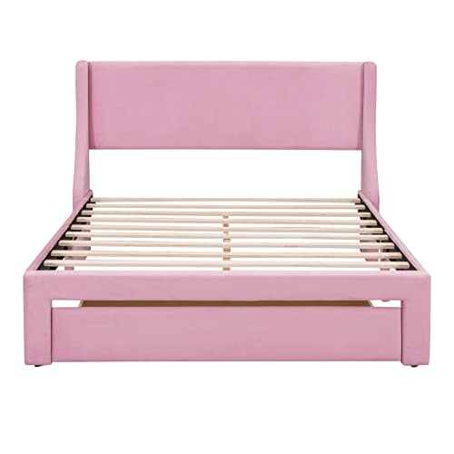 Full Size Velvet Upholstered Platform Bed Frames with Large Storage Drawer, Modern Platform Bed with Comfy Headboard, No Box Spring Needed for Bedroom Small Living Space Boys Girls (Blue, Full)