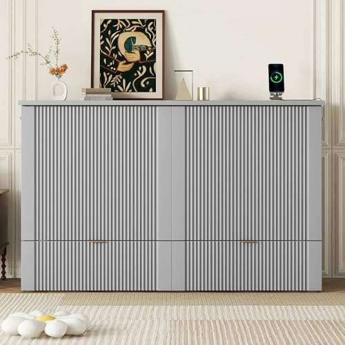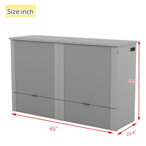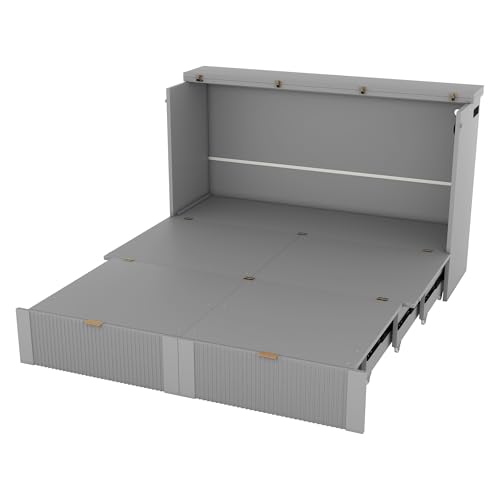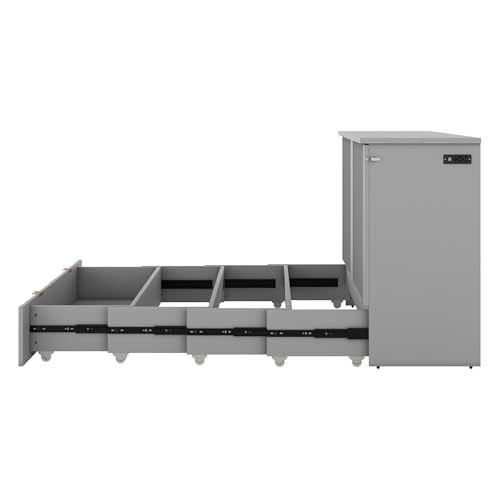 Multi-Functional Night & Day Furniture Murphy Cabinet Bed Wall Bed Frame Murphy Bed Chest with Built-in Power Strip & USB Ports & Drawers Full Foldable Platform Bed Pulley Structure Design Gray,King