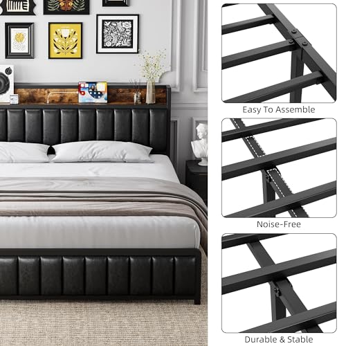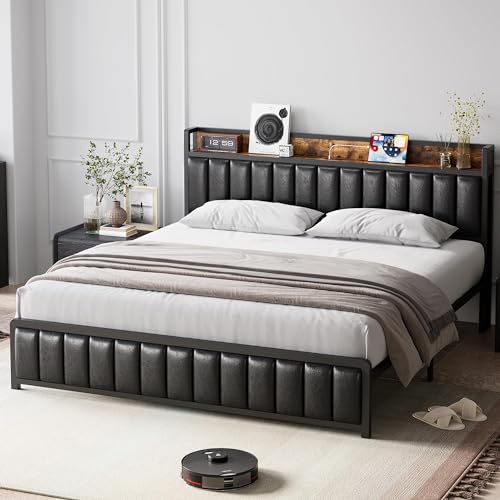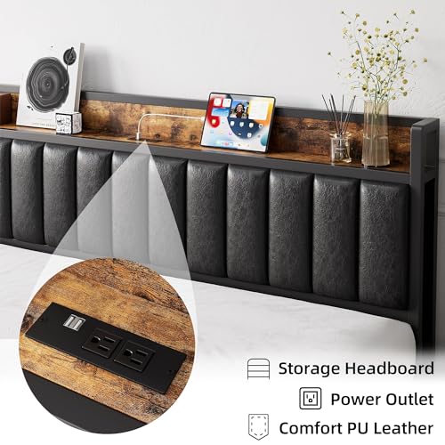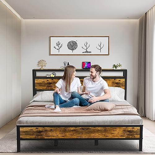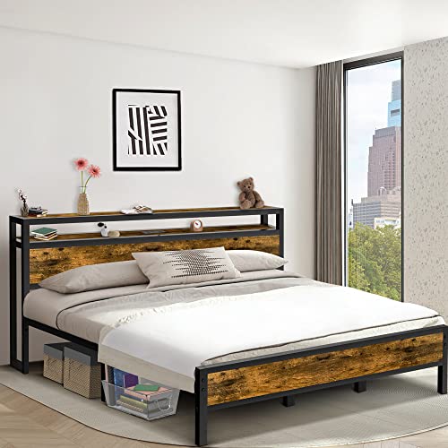 King Size Bed Frame Industrial Platform Bed with Charging Station 2-Tier Storage Headboard and Strong Support Legs, Noise-Free, No Box Spring Needed, Vintage Brown