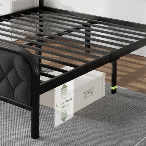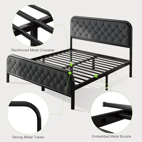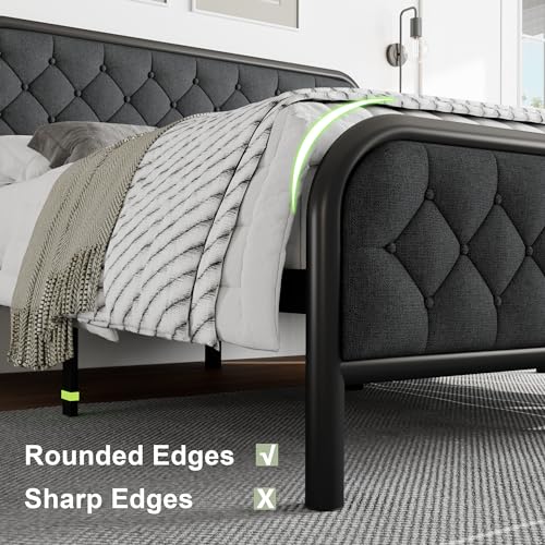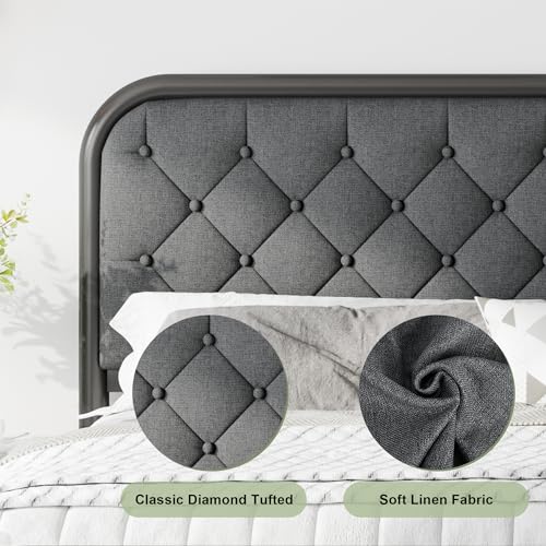 Feonase King Size Bed Frame, Upholstered Bed Frame with Diamond Tufted Headboard, Heavy Duty Metal Slats, 12" Storage Space, No Box Spring Needed, Easy Assembly, Grey