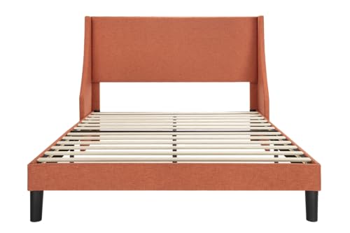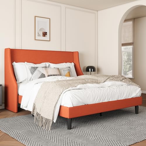 SHA CERLIN Upholstered Bed Frame Queen Size with Streamlined Wingback Headboard, Breathable Linen Fabric, Solid Wooden Slats, Easy Assembly, Yellow