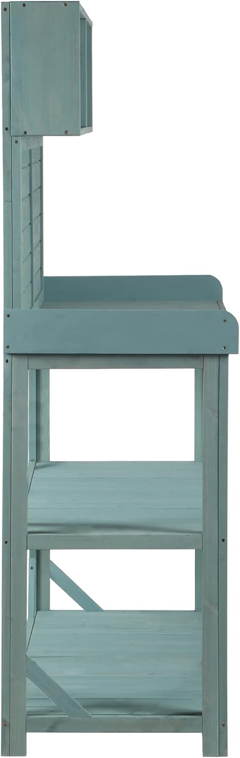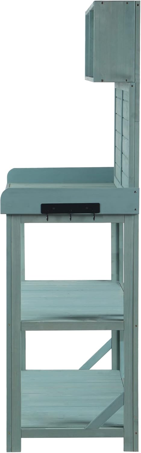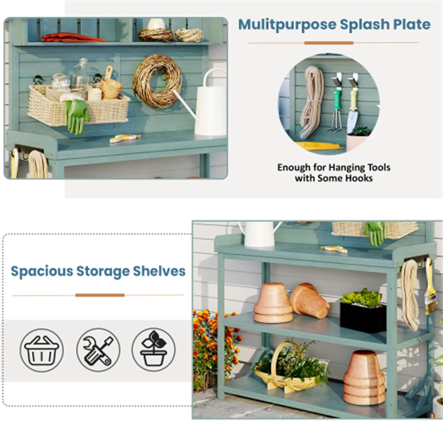65" H Garden Wooden Potting Bench Table with 4 Storage Shelves and 3 Side Hook, Large Farmhouse Rustic Outdoor Patio Workstation w/Splash Plate & Anti-Falling Device, for Backyard Balcony, Green