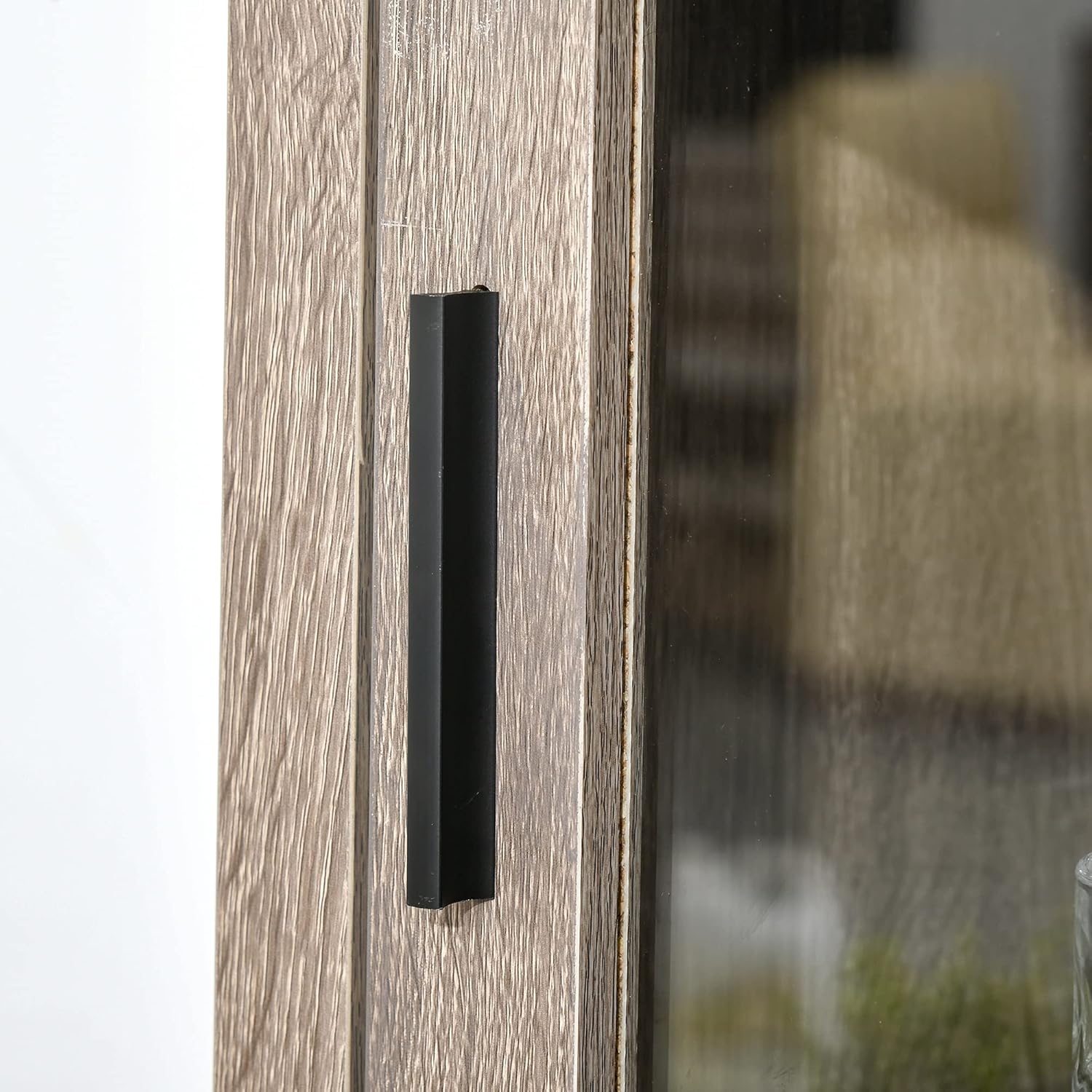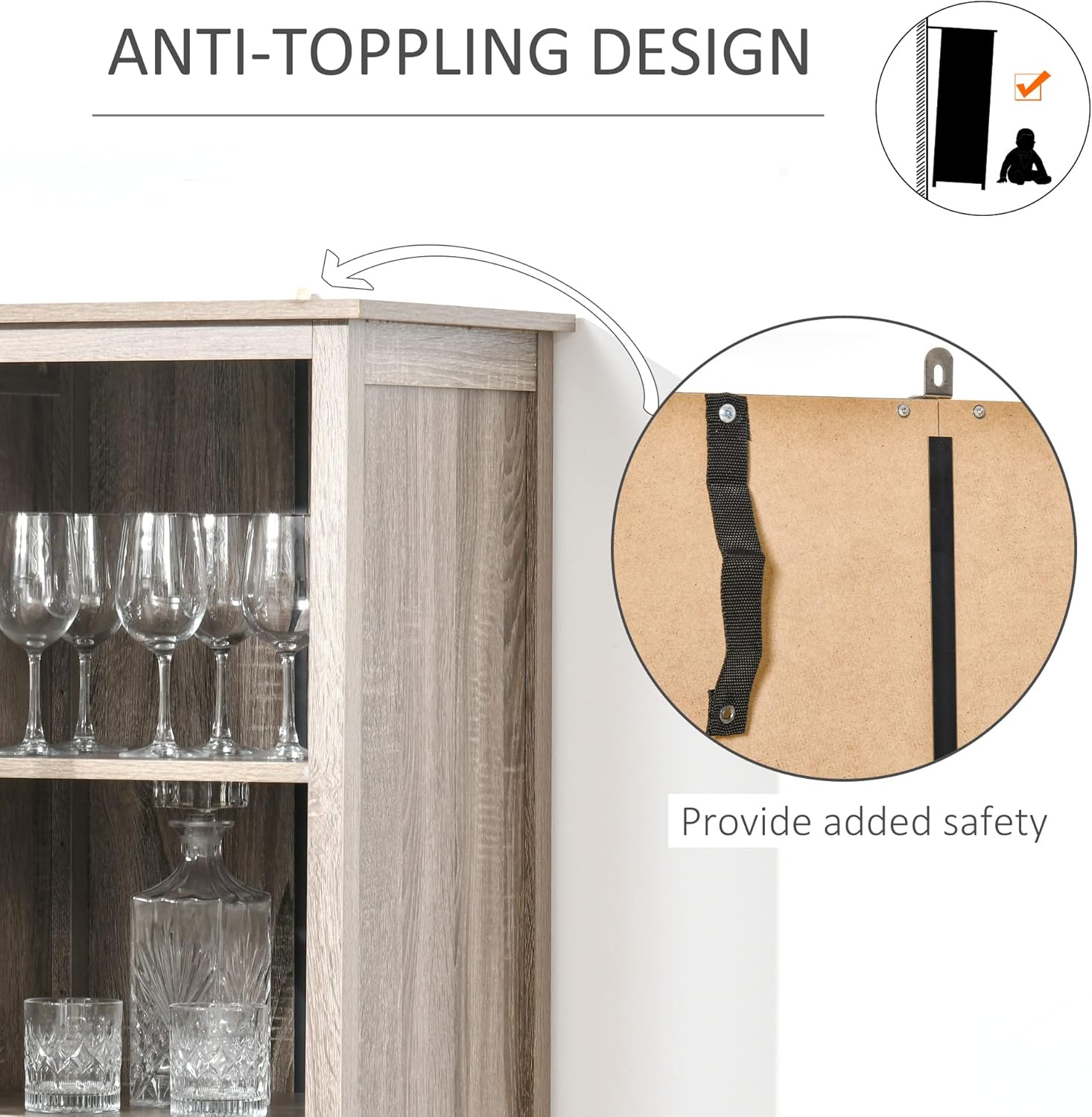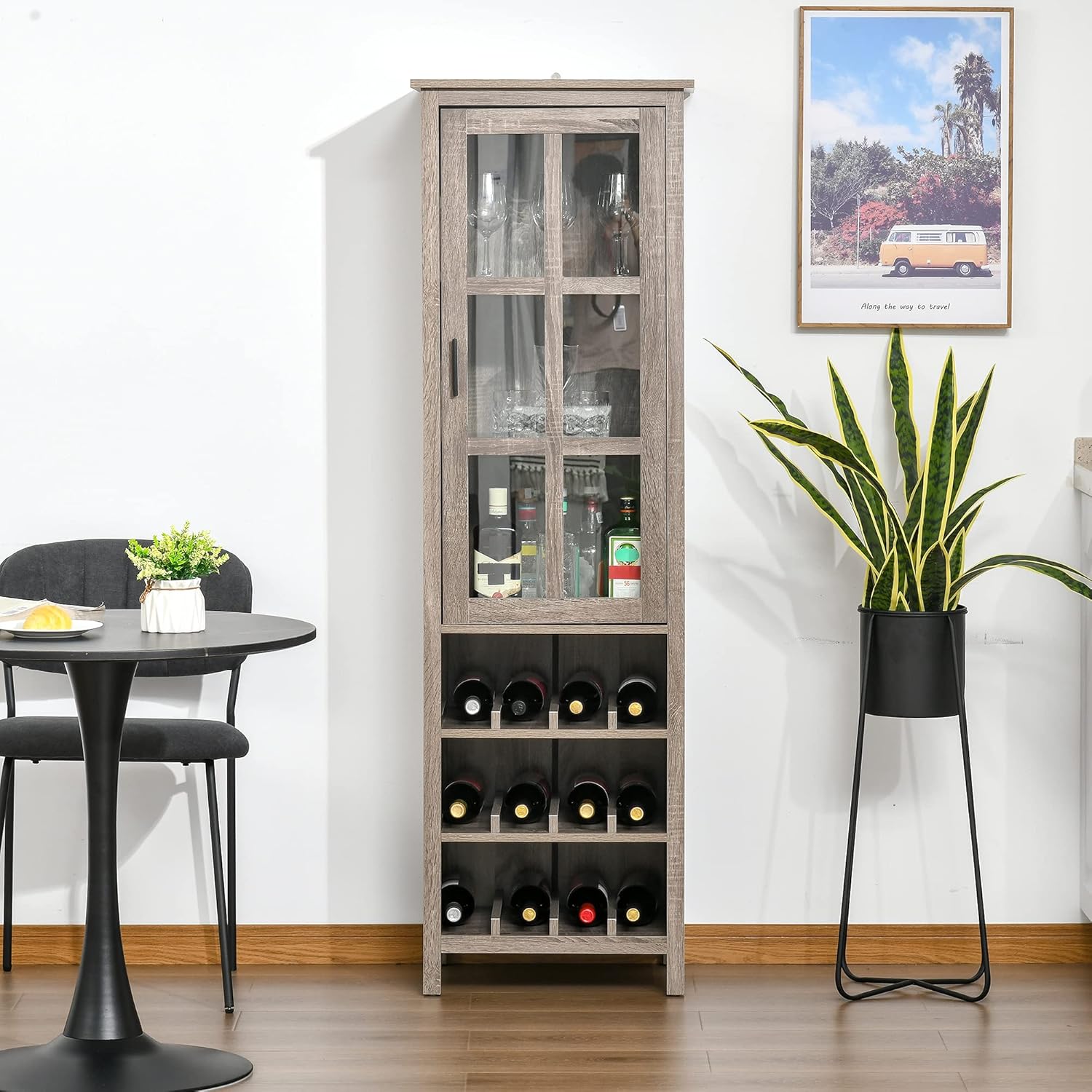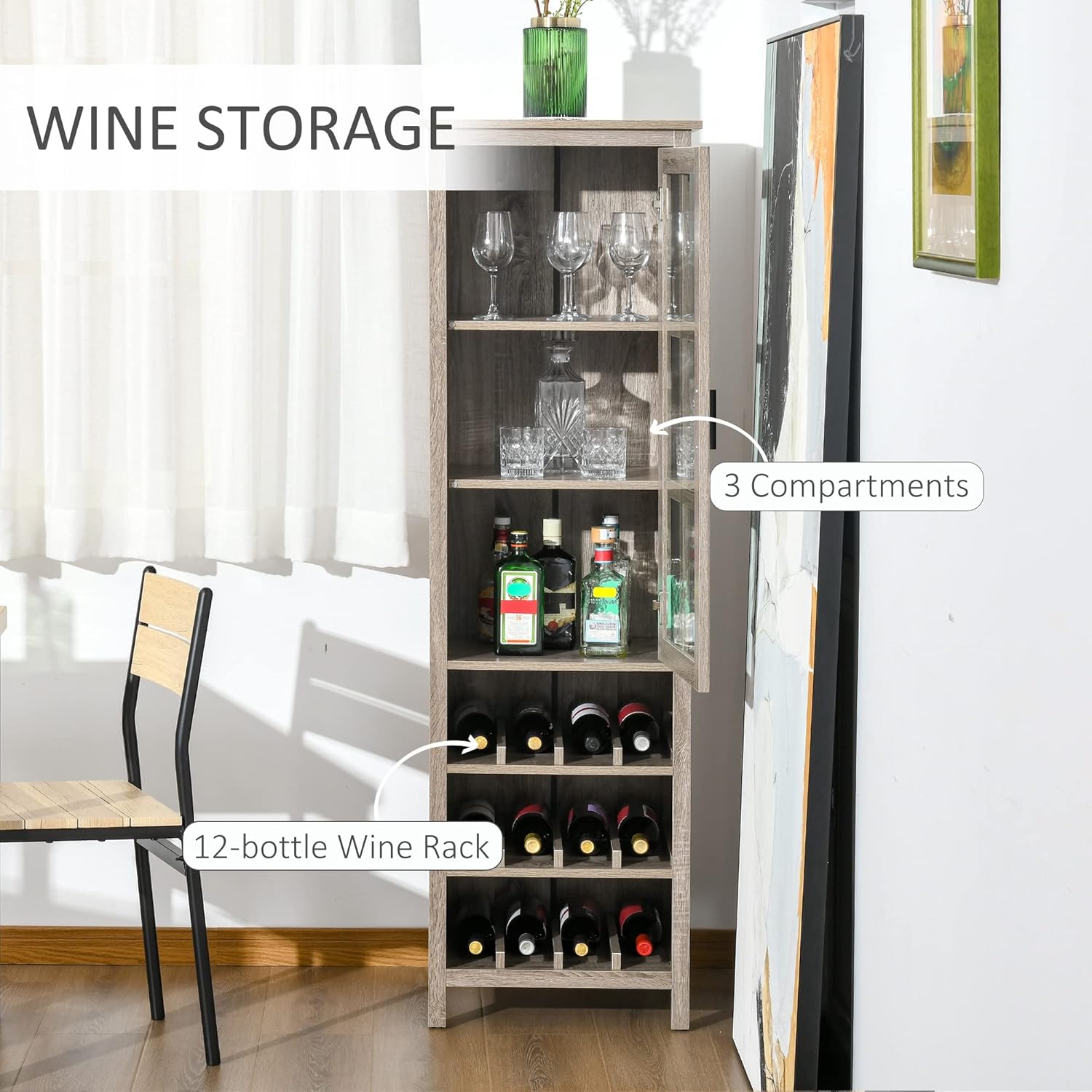 HOMCOM Tall Wine Cabinet, Bar Display Cupboard with 12-Bottle Wine Rack, Glass Door and 3 Storage Compartment for Living Room, Home Bar, Dining Room, Grey Oak