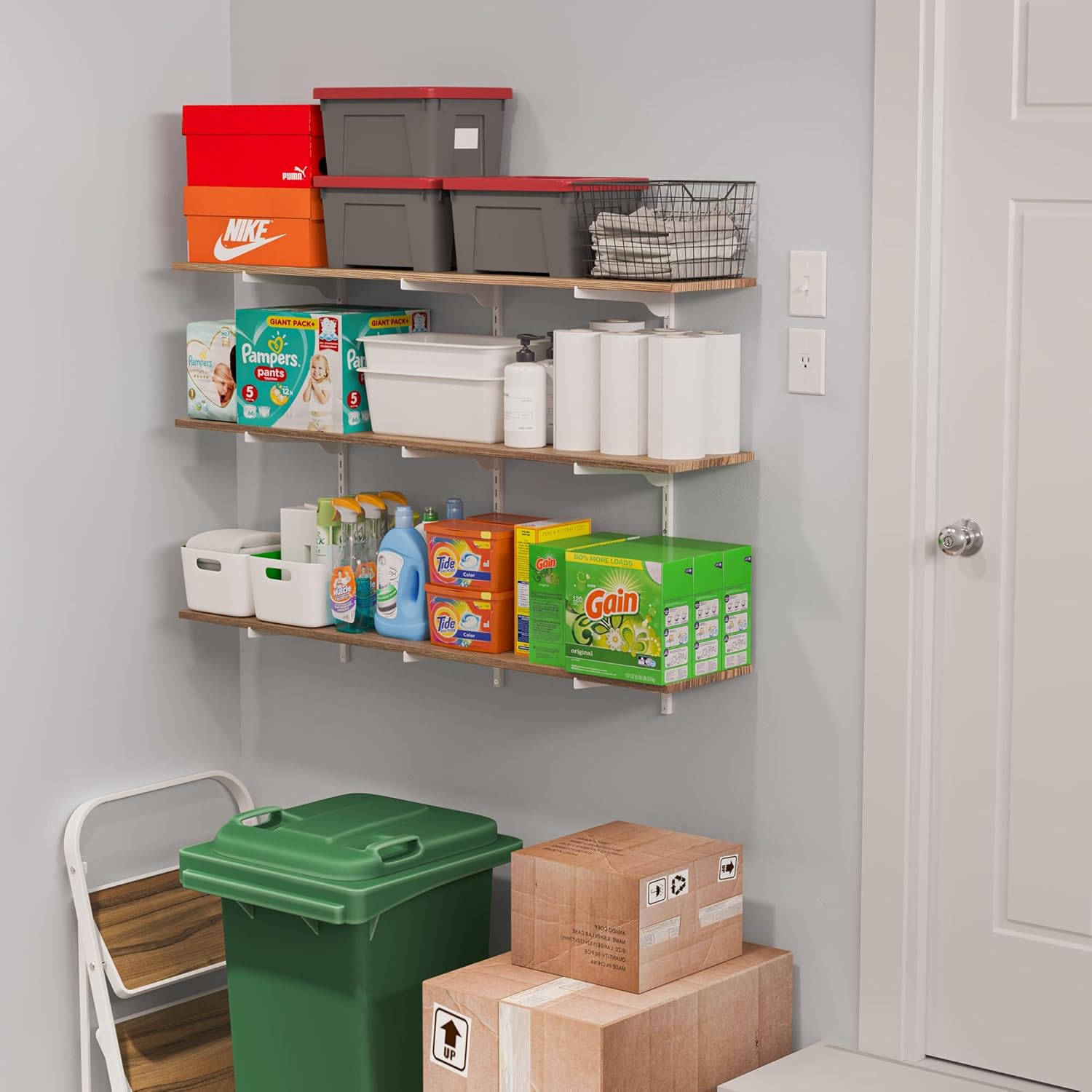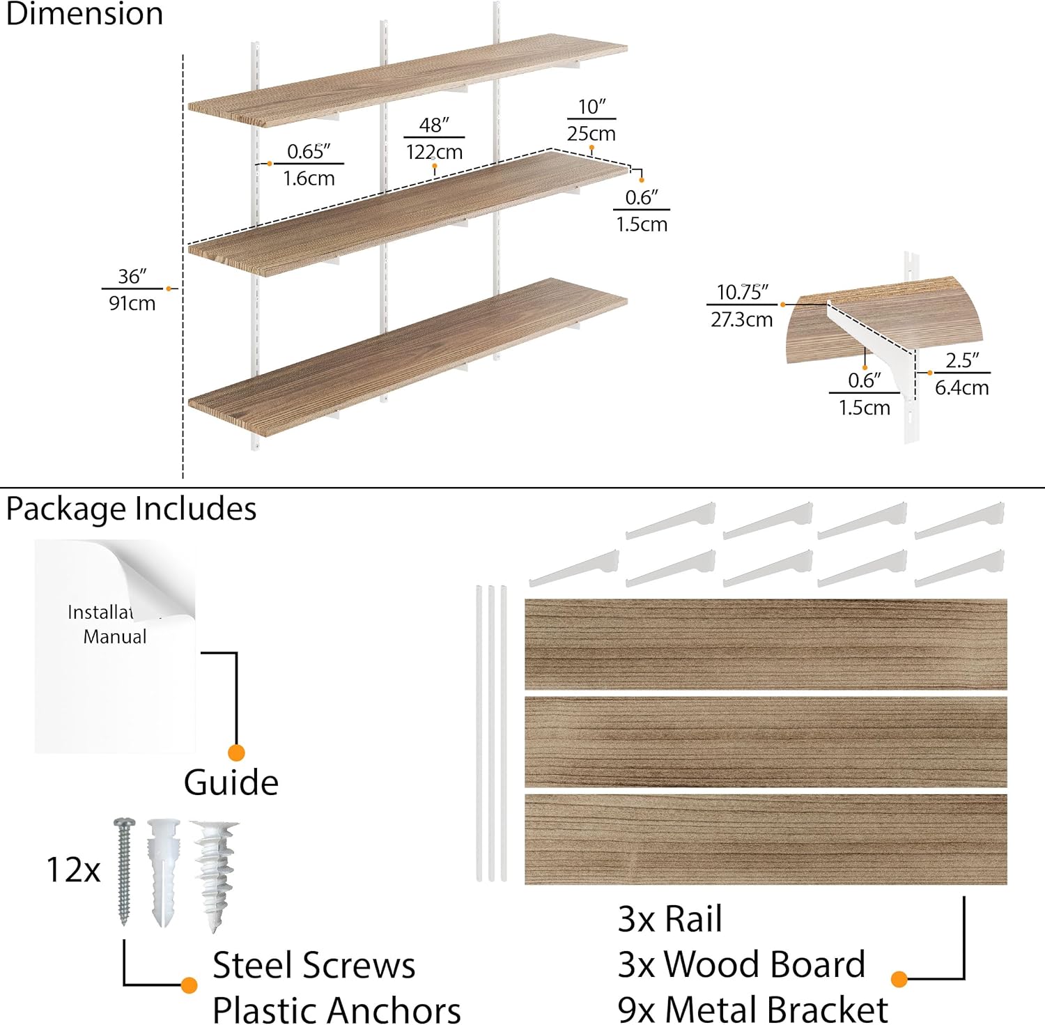 Wallniture Turin 48"x 10"Rustic Floating Bookcase, Wall Storage Shelf, Wall Book Shelves with Adjustable Metal White Brackets, Book Shelf for Wall, Storage Shelving Unit, Garage, Pantry, Burnt