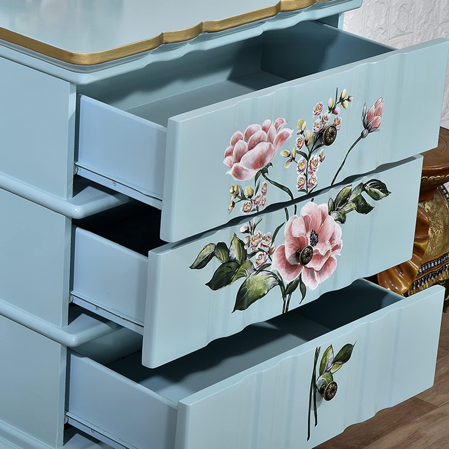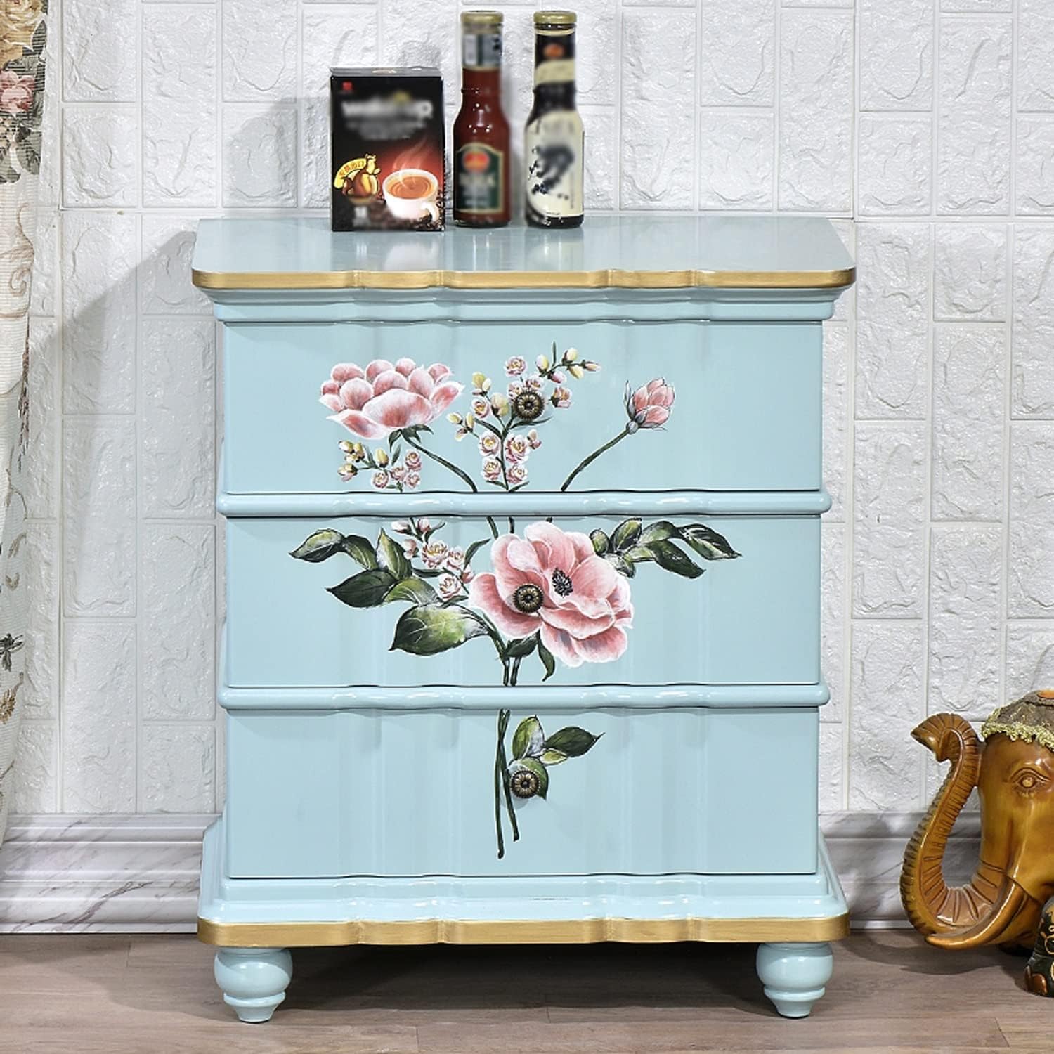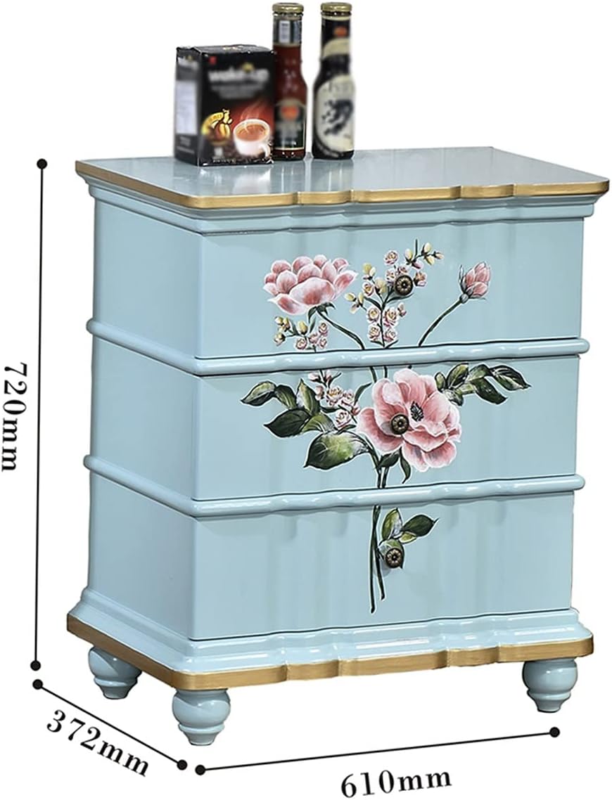 Light Luxury Nightstand, Exquisite Painting Corner Table Bedside Tables with 3 Drawers, Wooden Big Storage Cabinet Home Furniture for House Bedroom