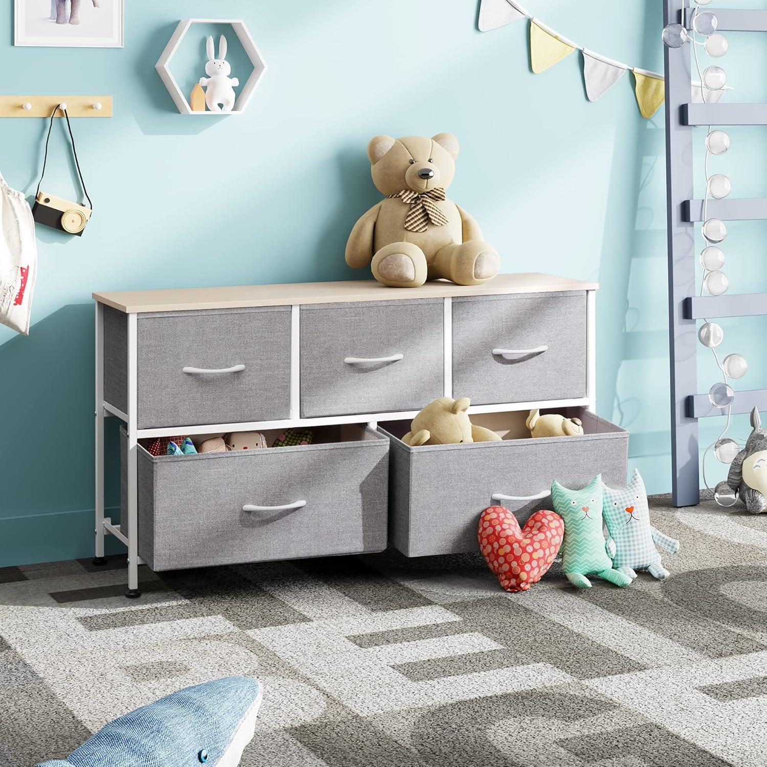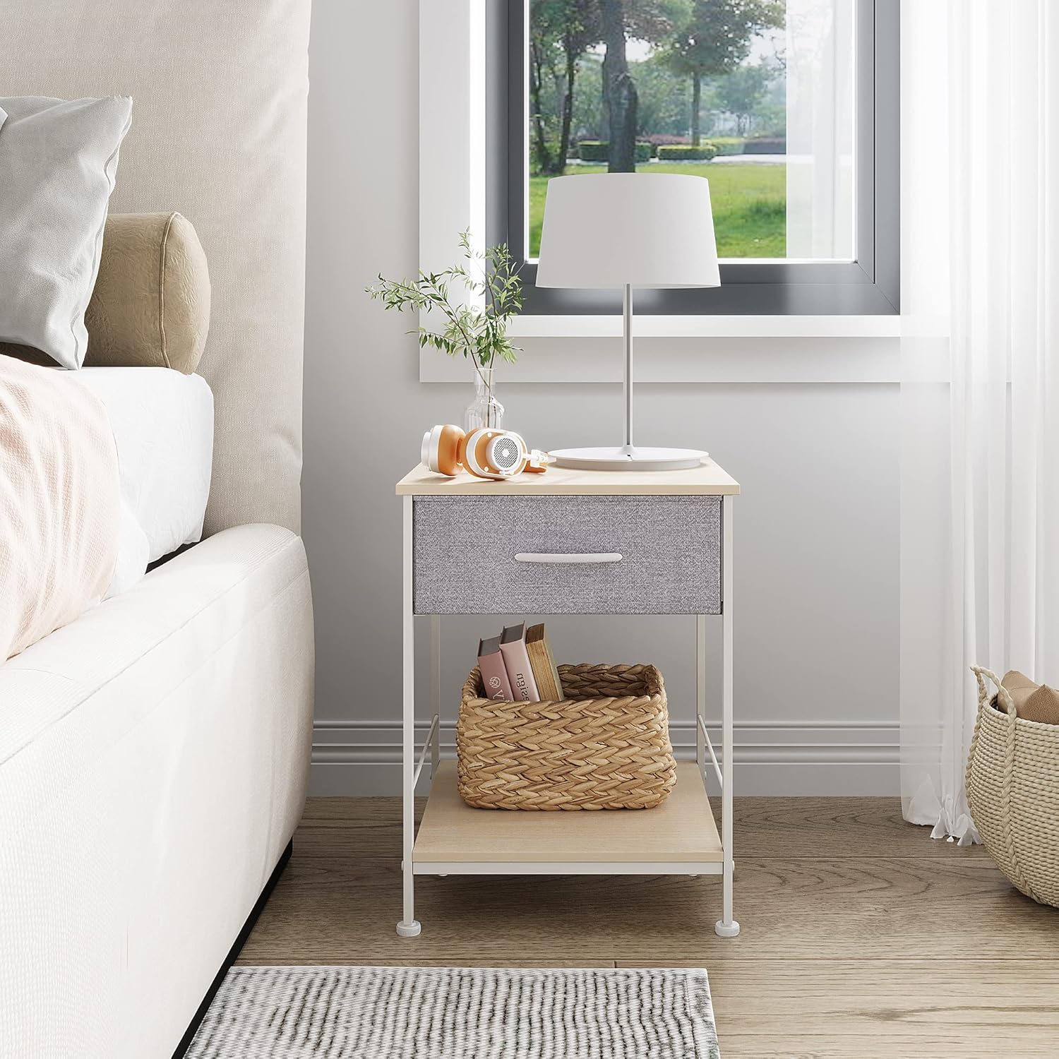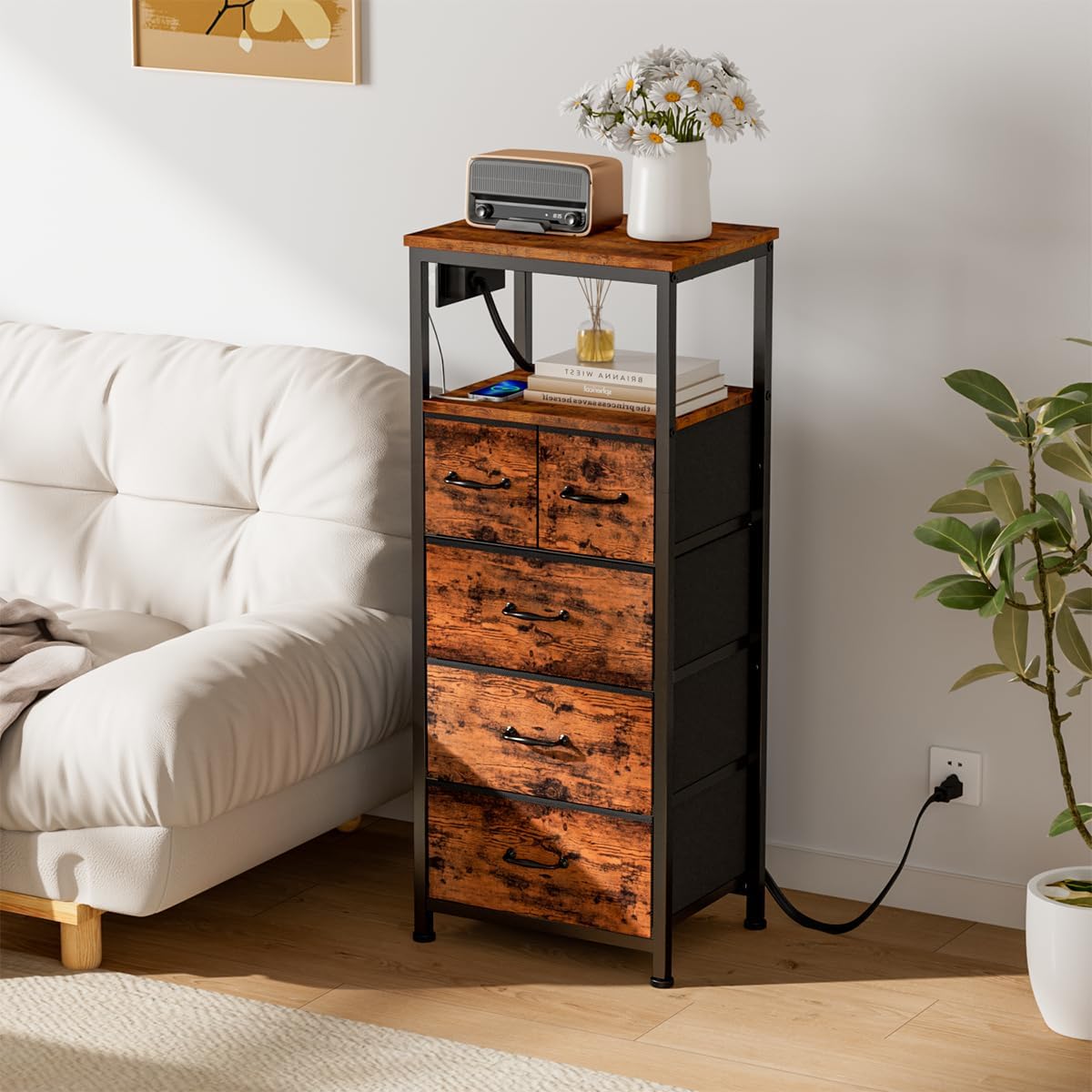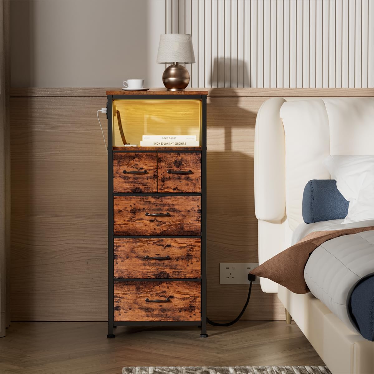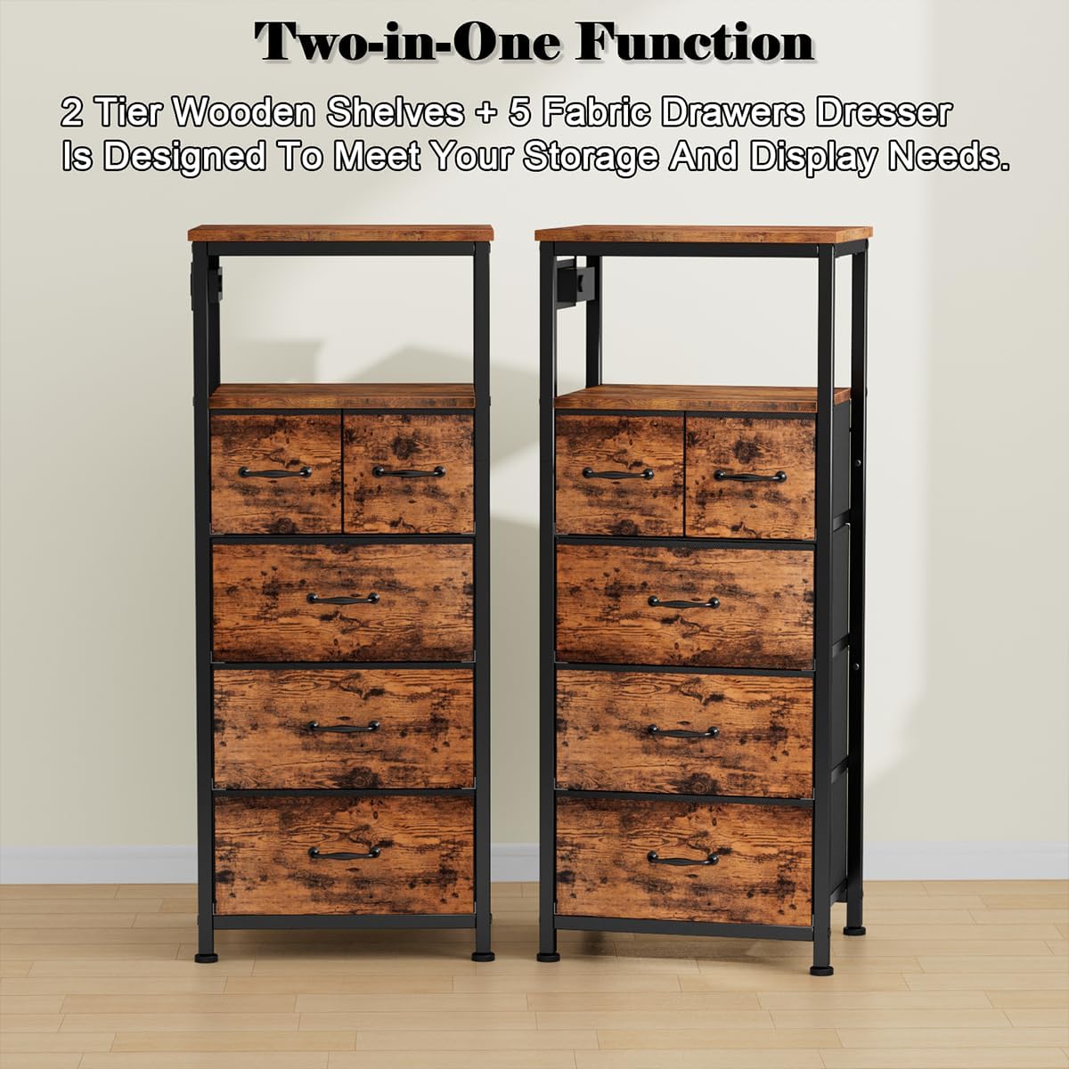 WLIVE 1-Drawer Nightstand and 5-Drawer Dresser Set, Fabric Storage Tower for Bedroom, Hallway, Nursery, Closets, Tall Chest Organizer Unit with Textured Print Fabric Bins, Steel Frame