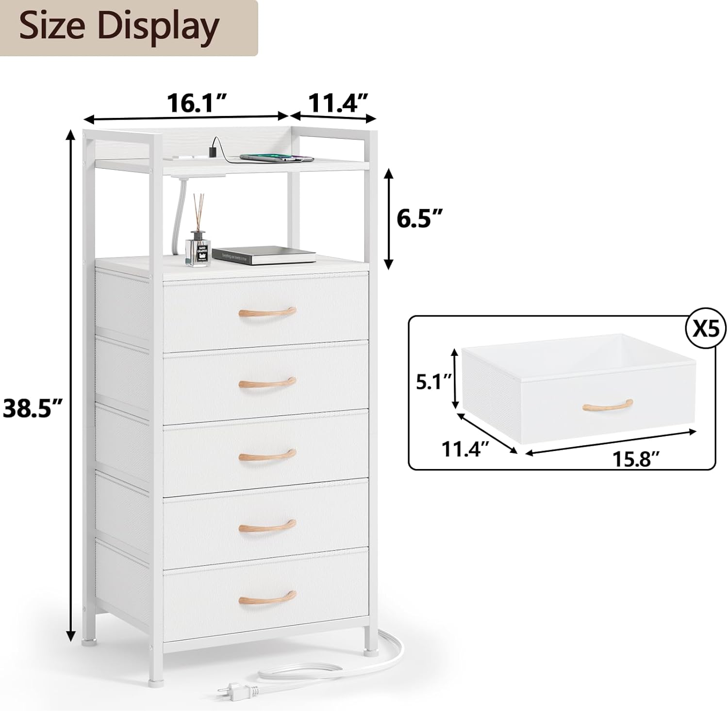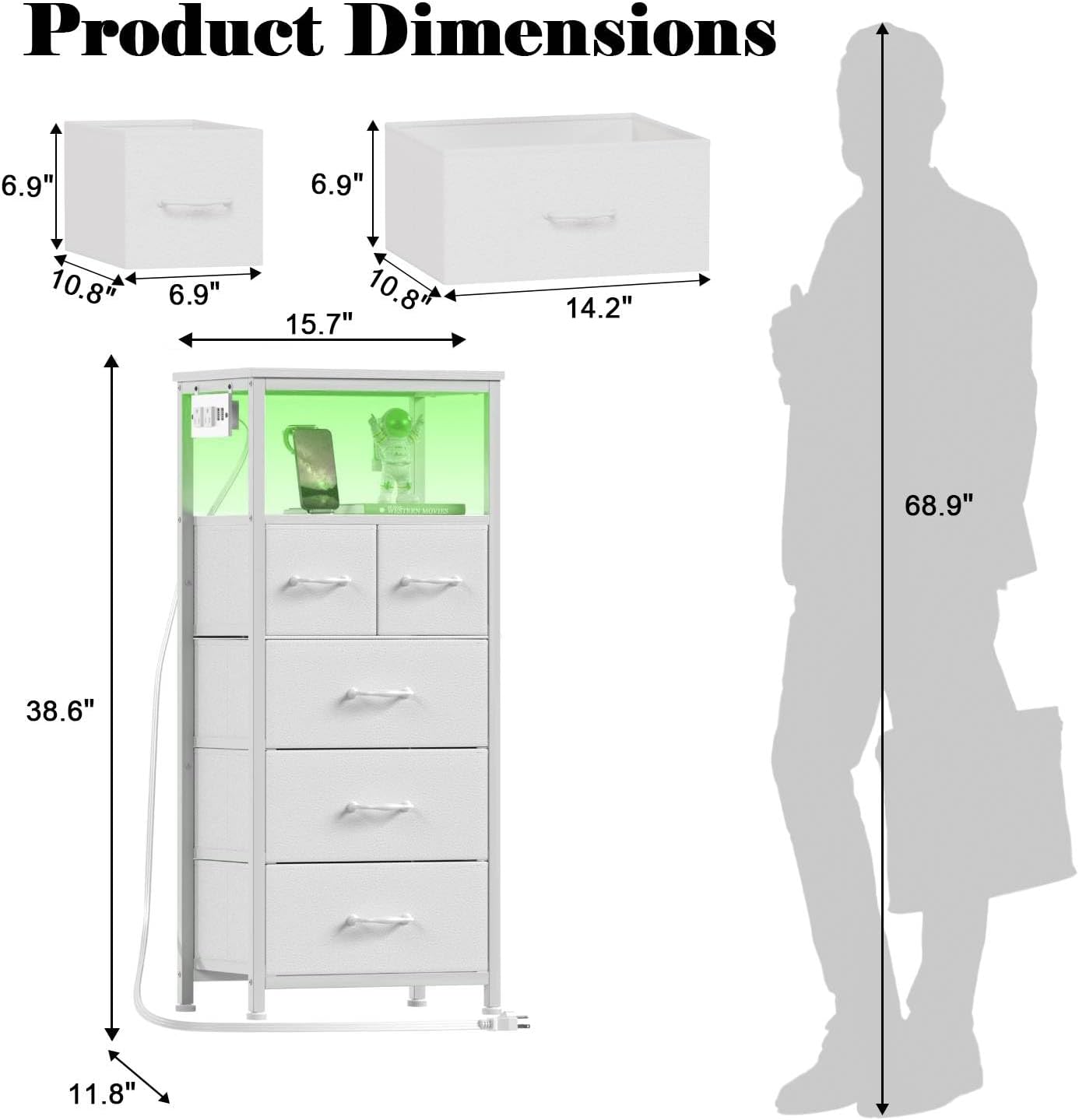 Furnulem White Nightstand with Storage Drawer, Tall Dresser for Bedroom with Led Light and Charging Station, Side Table Nightstand for Closet, Fabric Bins, Metal Frame, Wood Shelf(White)