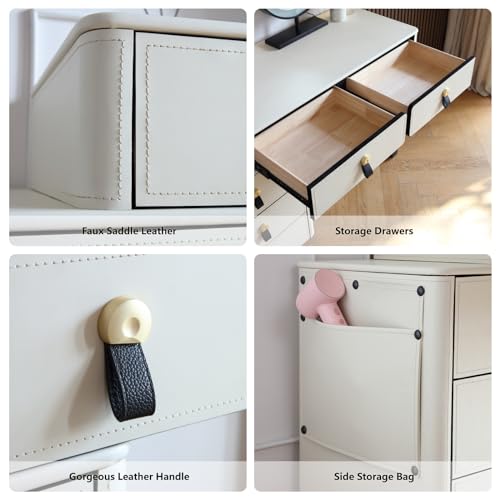 Faux Saddle Leather Makeup Vanity Desk Set with 5 Drawers & Side Storage Bag Dressing Table with Lighted Mirror, White