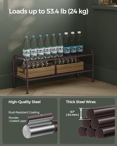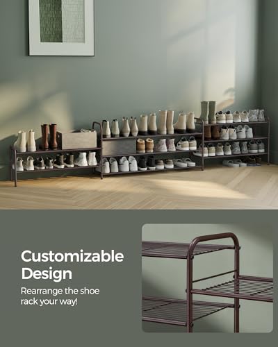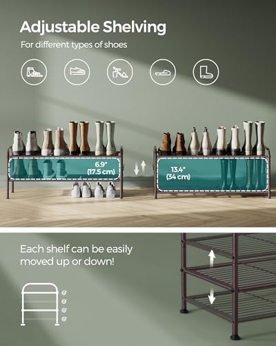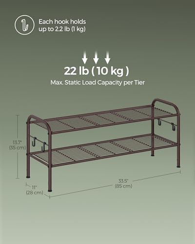 SONGMICS Shoe Rack, 3-Tier Shoe Organizer, Metal Shoe Shelf Storage with 4 Side Hooks, Holds 15 Pairs of Shoes, Height-Adjustable Shoe Rack for Entryway, Hallway, Closet, Easy Assembly, Chestnut Brown