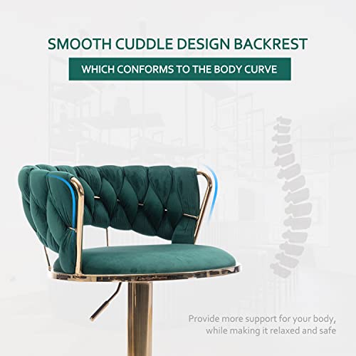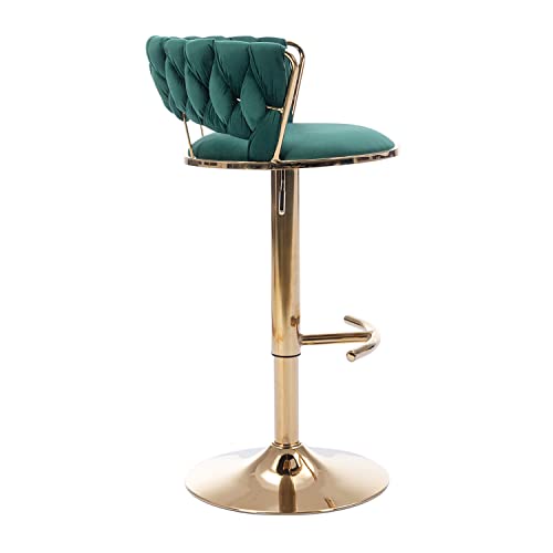 Kiztir Velvet Swivel Bar Stools Set of 2, Adjustable Counter Height Bar Chairs with Woven Back & Footrest, Luxury Gold Bar Stools for Kitchen Island, Cafe, Pub (Green)
