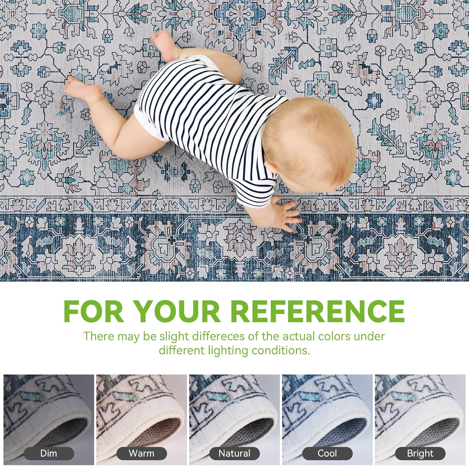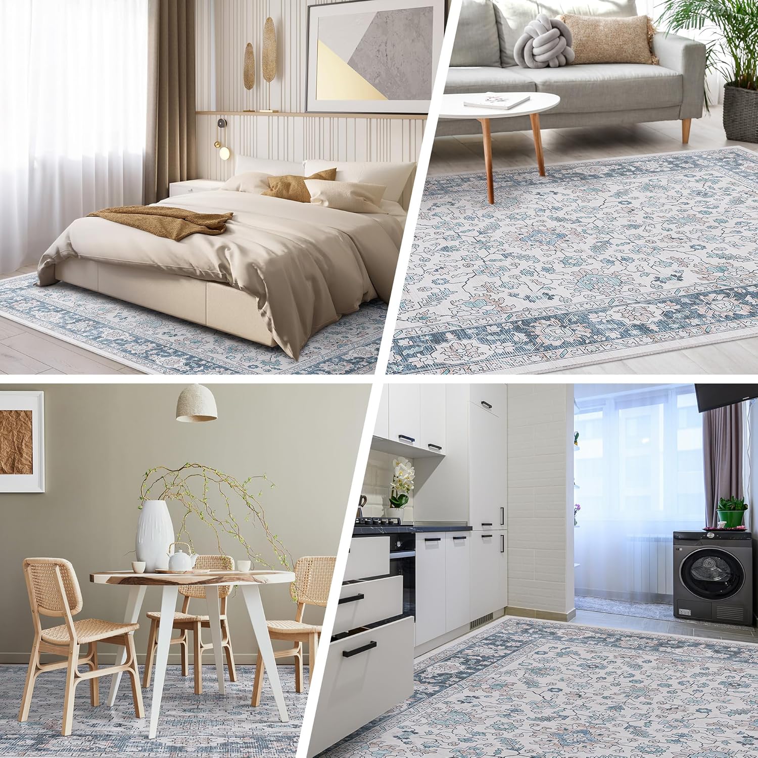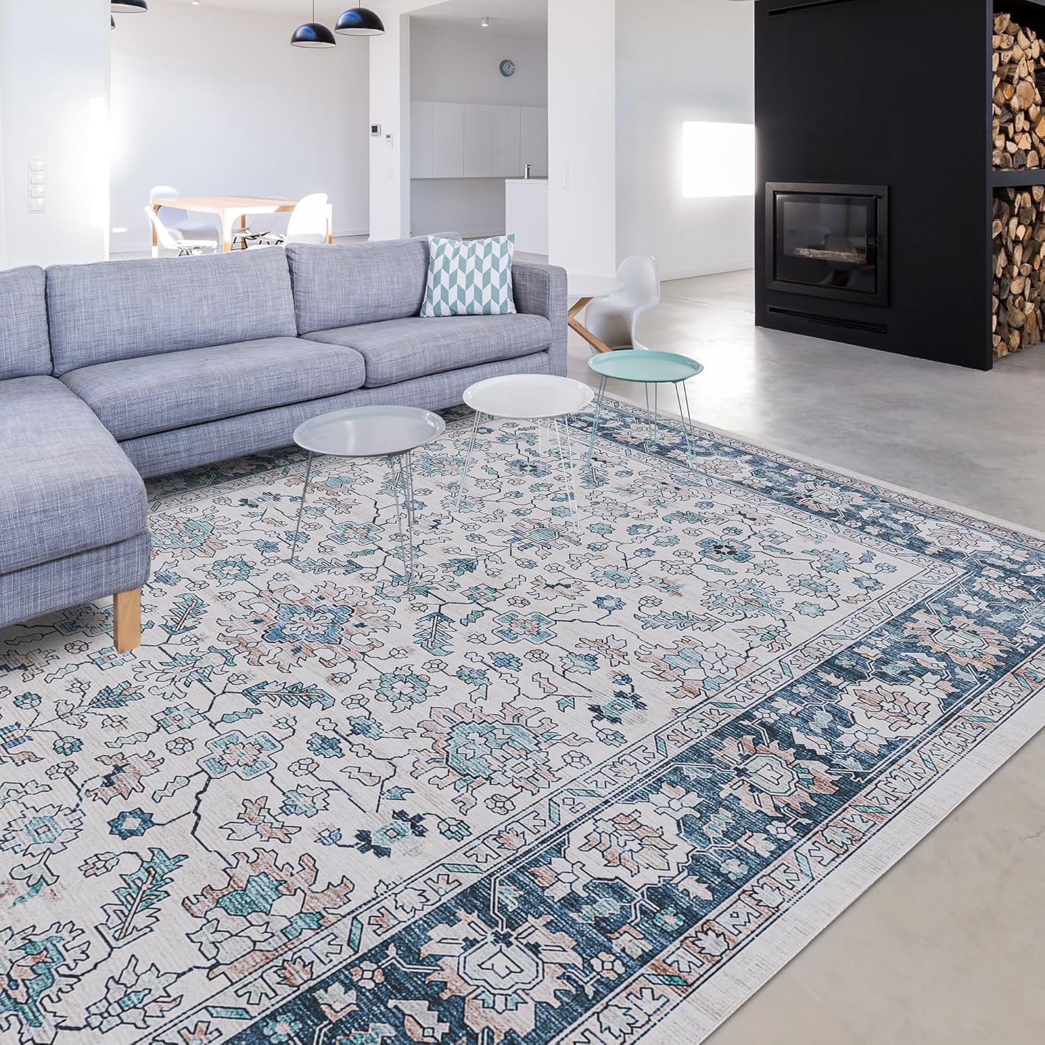 Area Rug for Living Room, 5x7 Area Rug Soft Carpet for Bedroom Non-slip Boho Rug Low-pile Machine Washable Rug Oriental Vintage Rug Carpet for Dining Room Navy Blue Cream