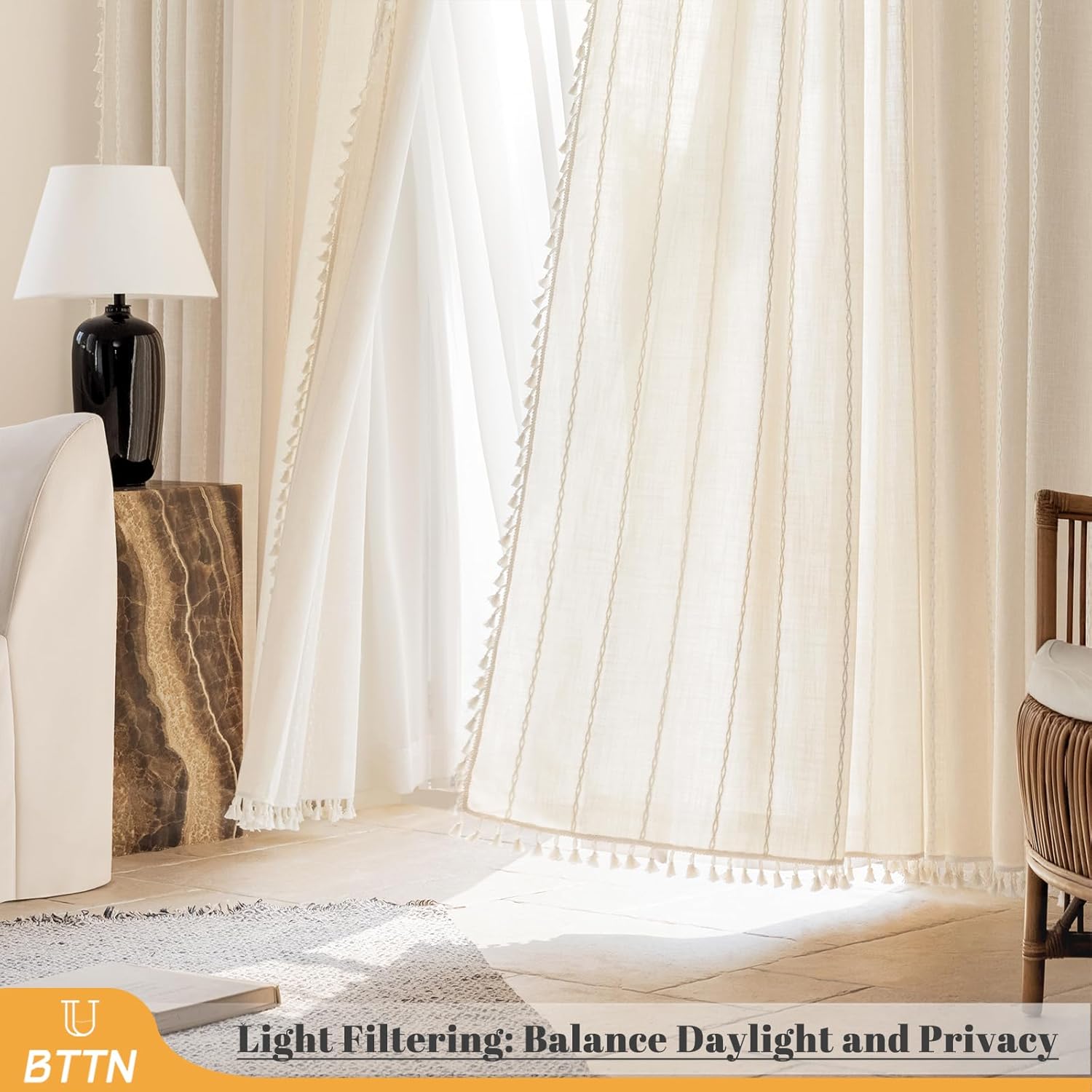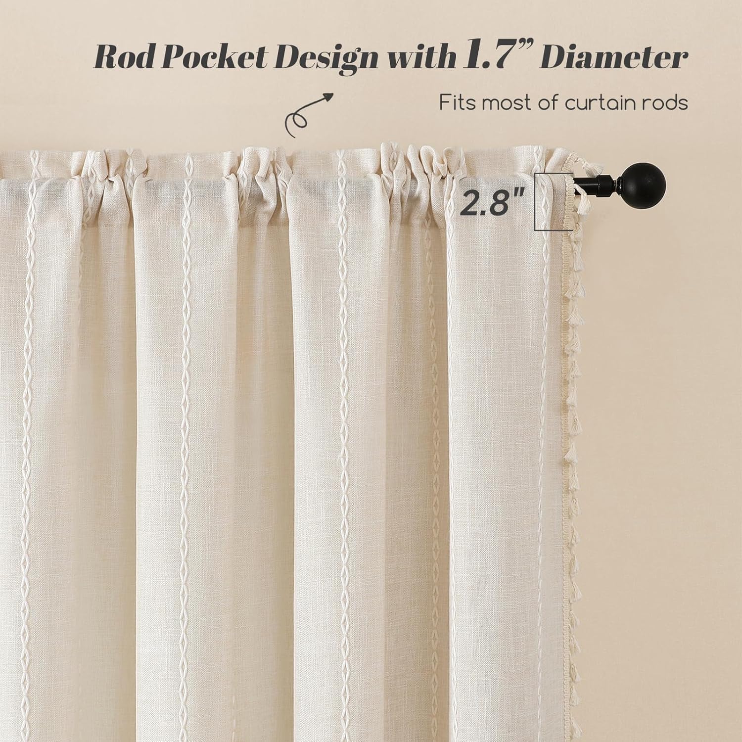 Cream Curtains 84 Inch Length 2 Panels Set, Long Boho Farmhouse Linen Striped Embroidery Drapes with Tassels for Bedroom Living Room, Light Filtering Rod Pocket Window Treatments, 52x84, Beige