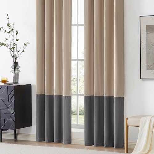 BULBUL Color Block Window Curtains Panels 96 inches Long Cream Ivory Green Velvet Farmhouse Drapes for Bedroom Living Room Darkening Treatment with Grommet Set of 2