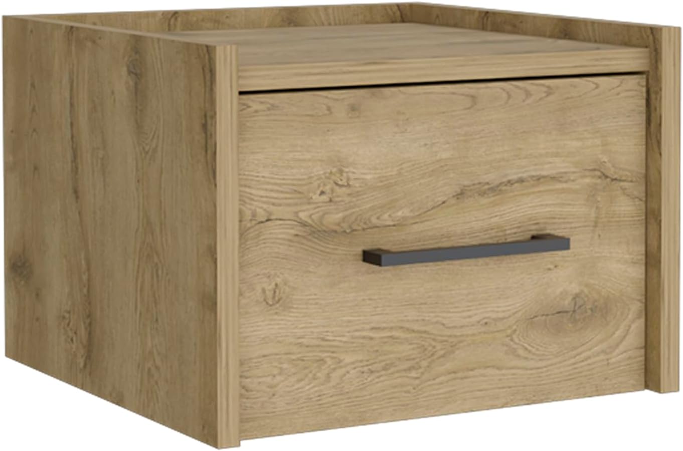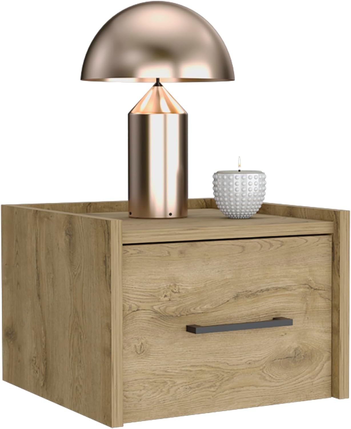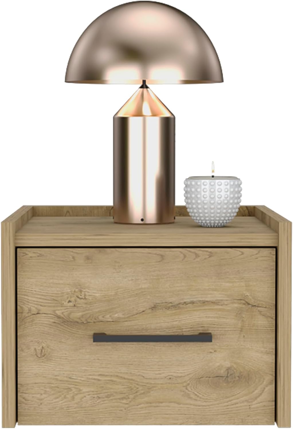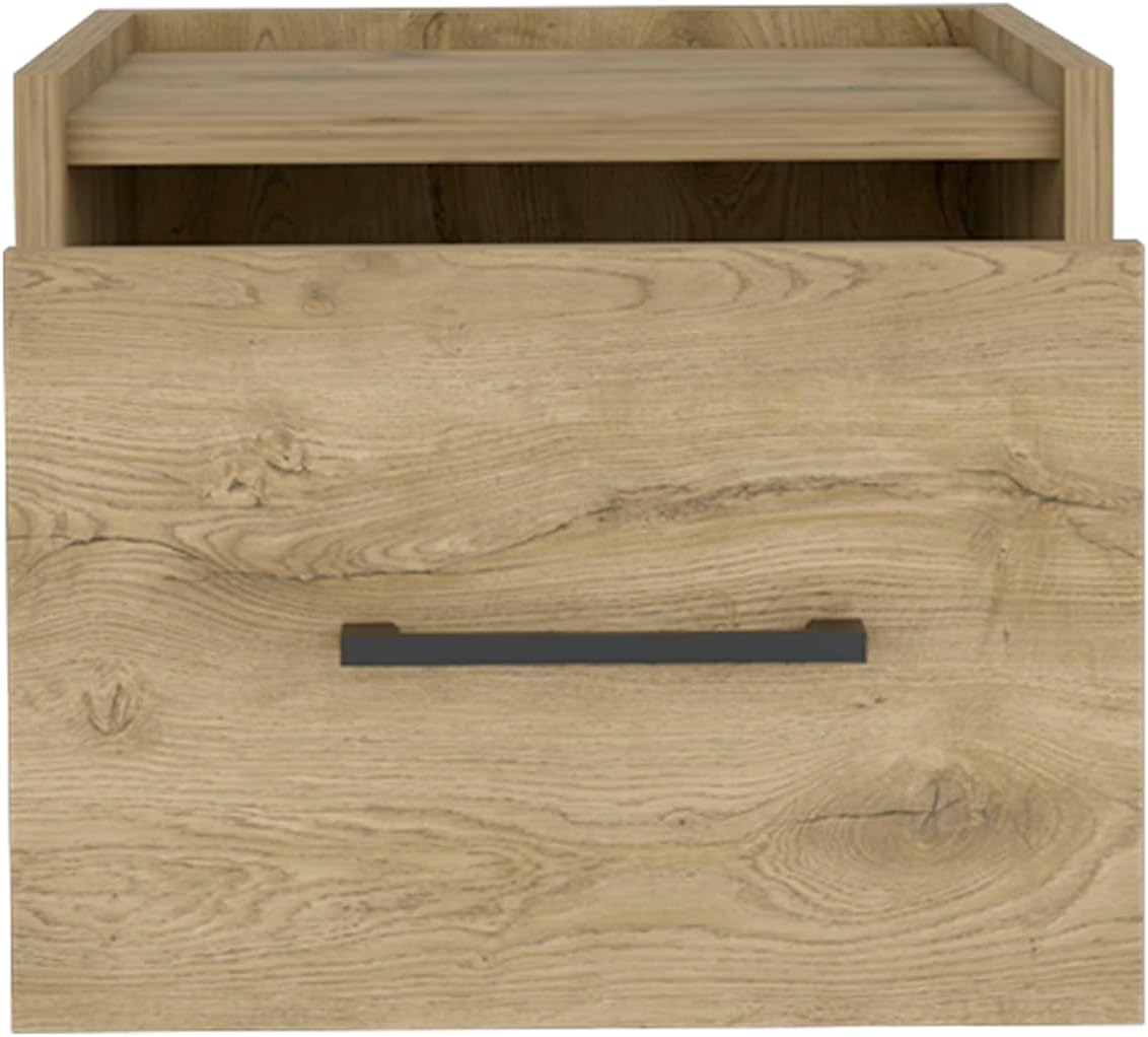 Macadamia Modern Floating Nightstand, Space-Saving Design with Convenient Drawer and Black pull Handle.