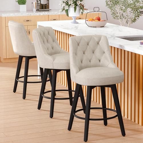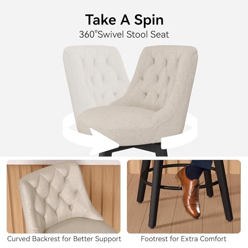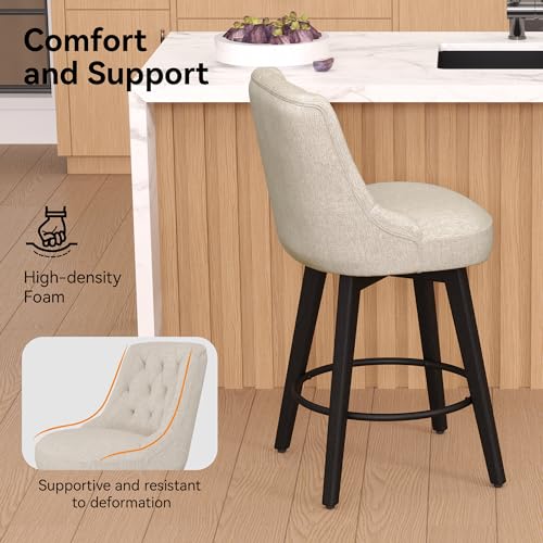 Modern 26 inch Upholstered Bar Stools, Thickened Counter Height Swivel Barstool Set, Faux Leather Bar Chairs with High Back, Wood Legs for Bar, Kitchen Island, Dining Room, Brown Seat