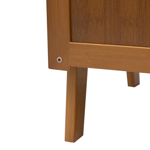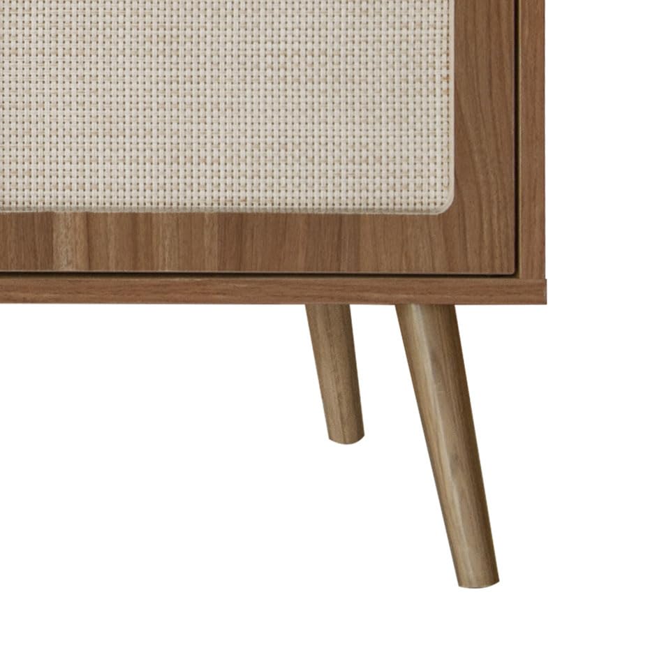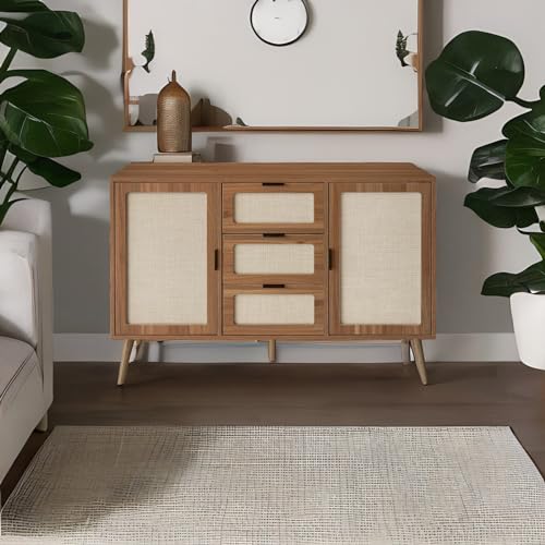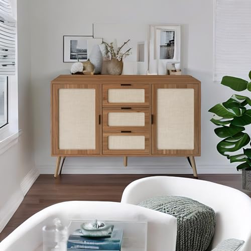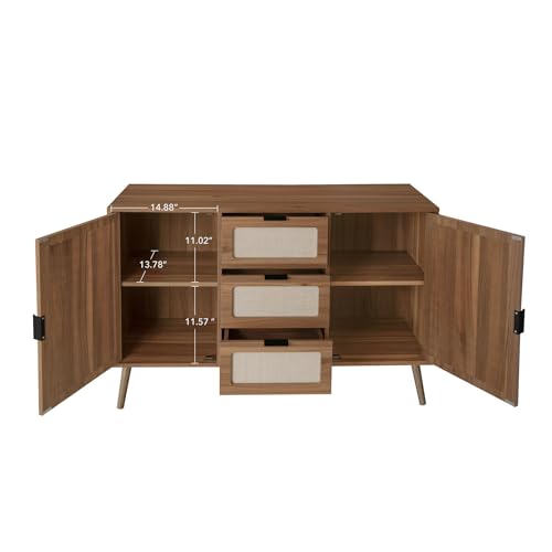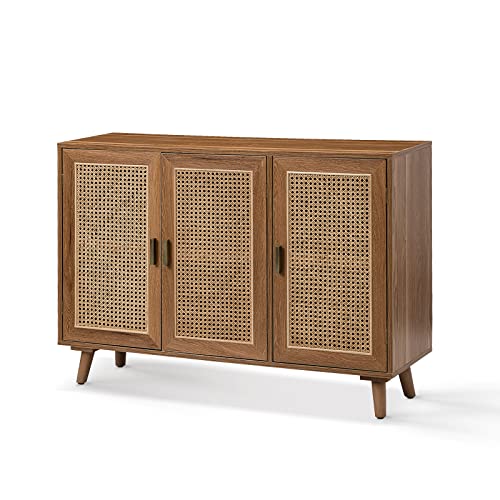 HULALA HOME Boho Accent Storage Cabinet with 3 Natural Rattan Doors & Wood Legs, 2-Tier Shelf Sideboard Buffet Cabinet
