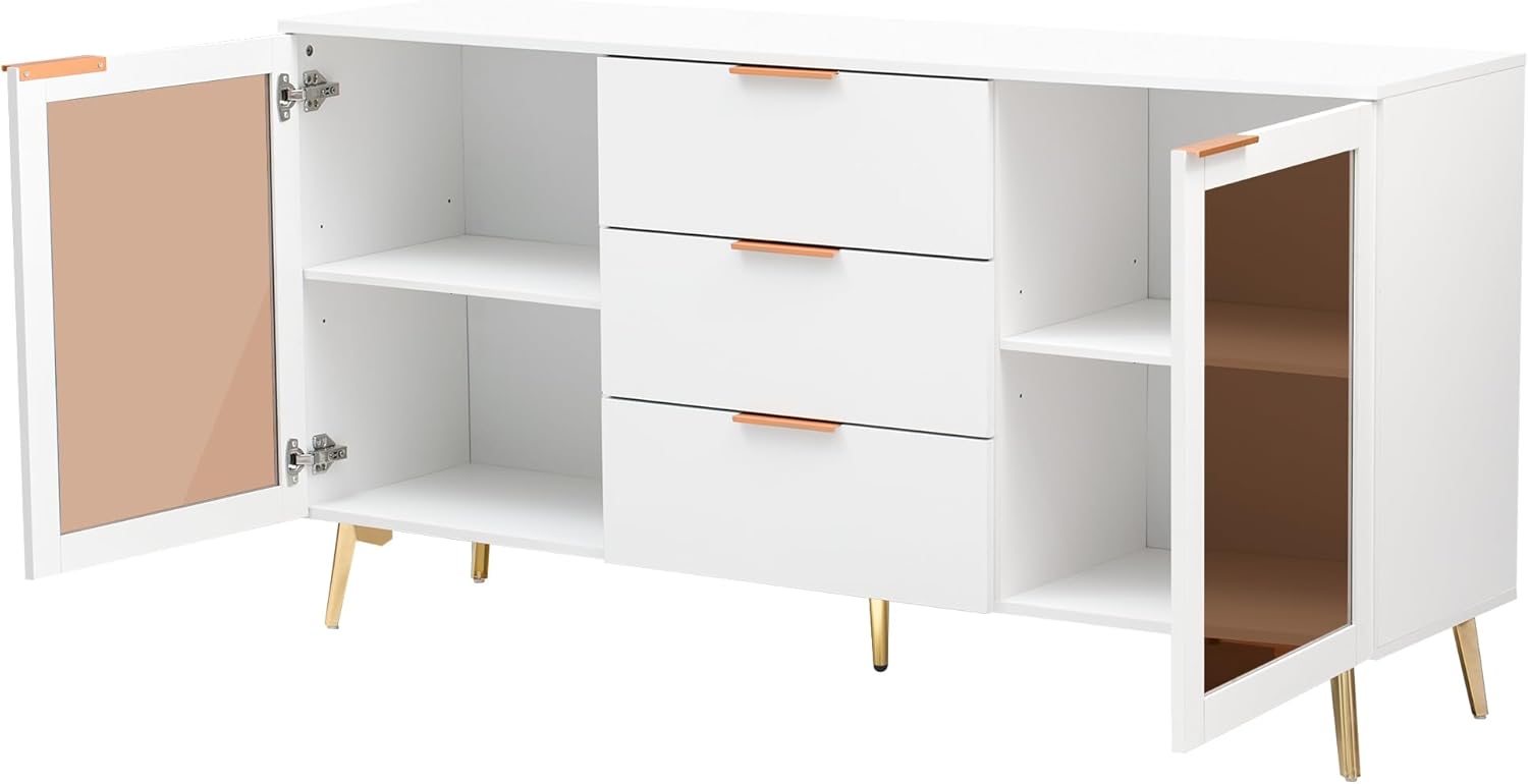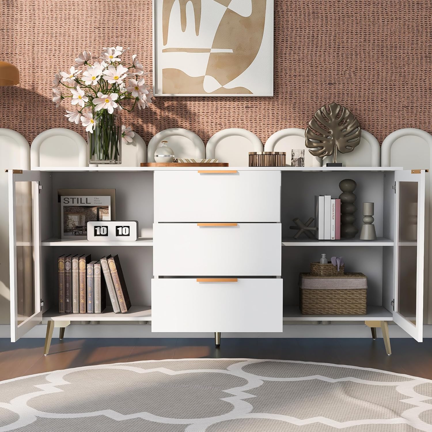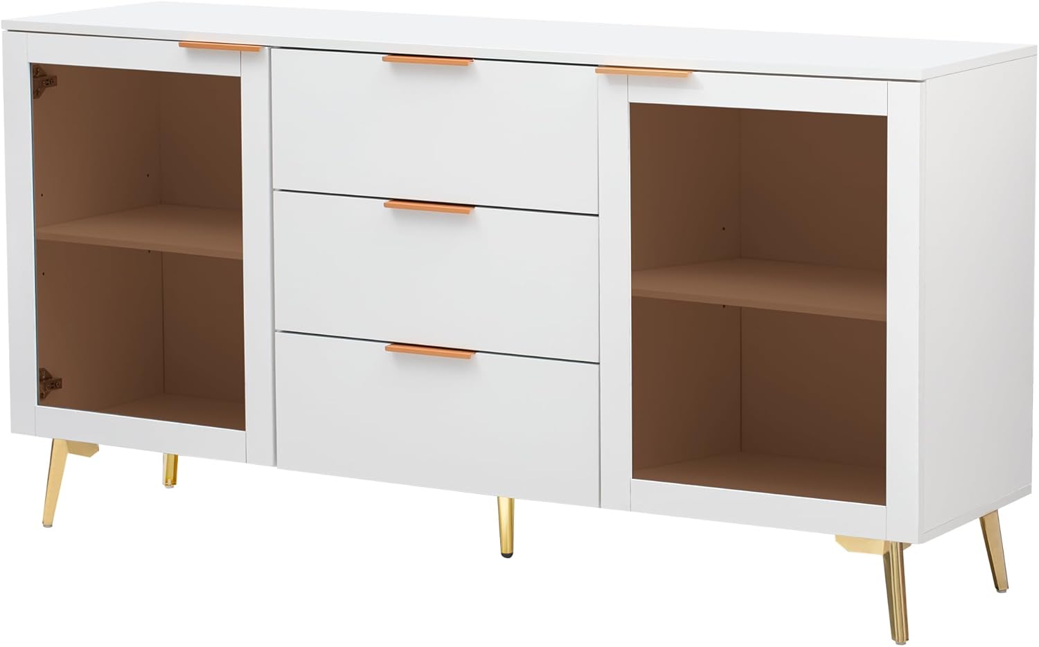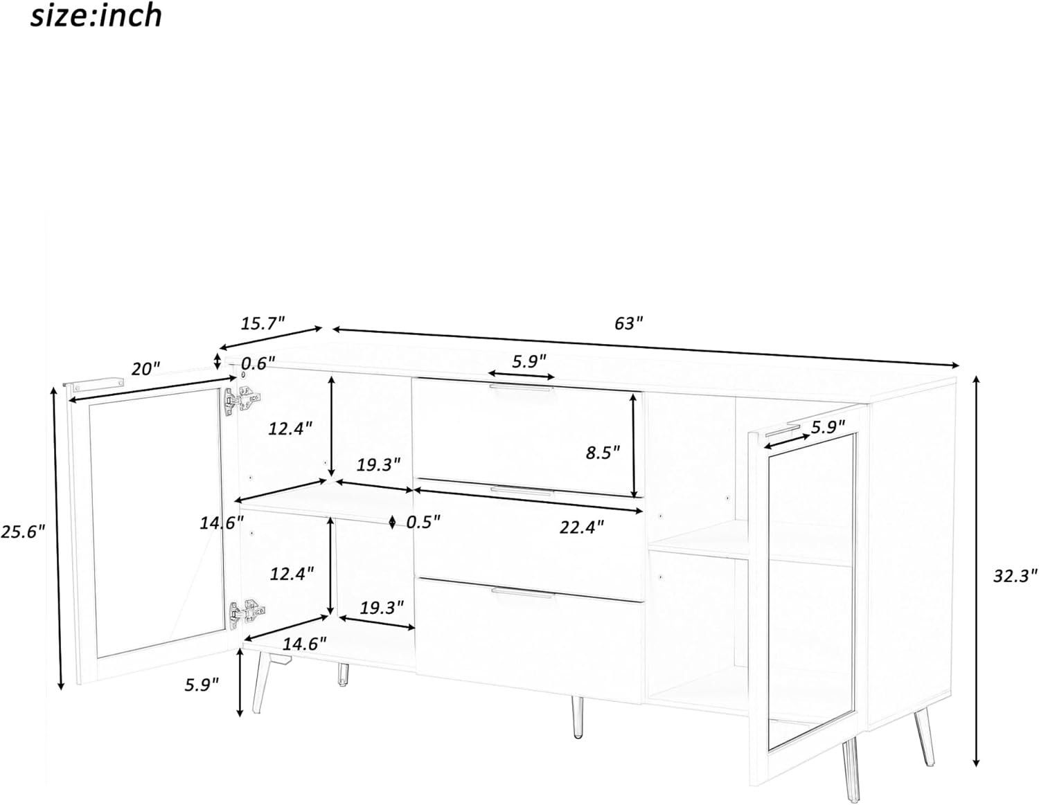 Modern Sideboard Buffet Cabinet with 2 Glass Door,3 Drawers,Narrow Long Storage Cabinet,Accent Cabinet,63” Multifunctional Console Cabinet,Buffet Server,Console Table,Cupboard,Bookcase