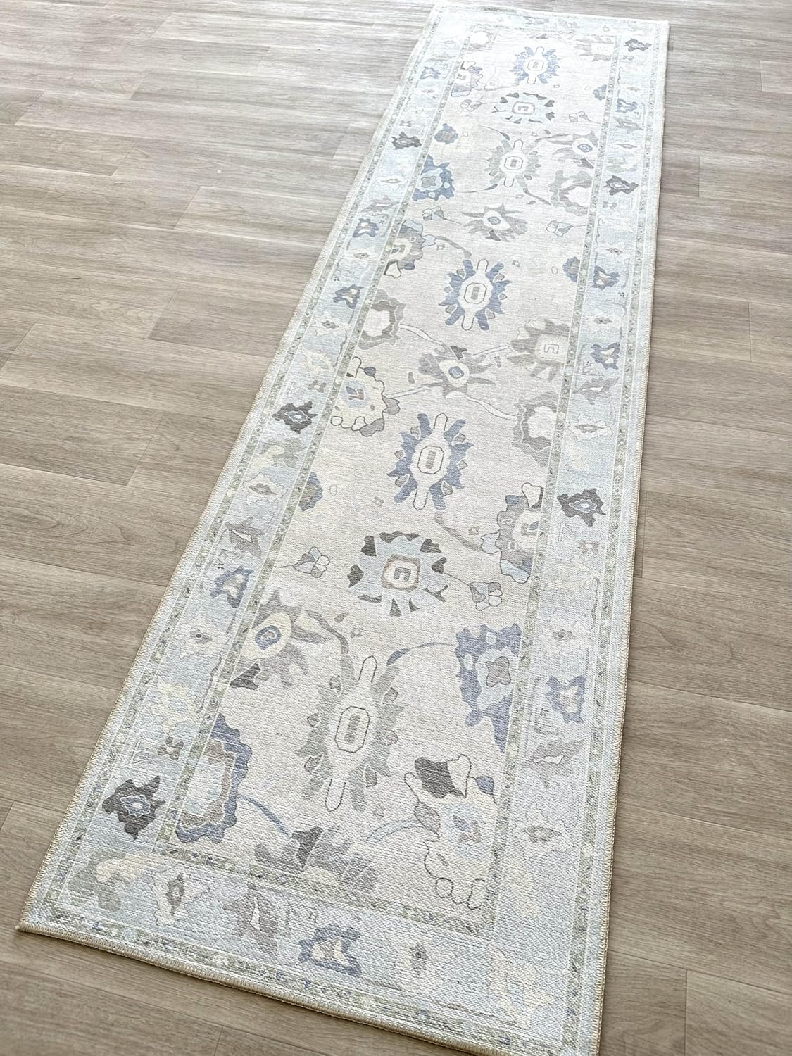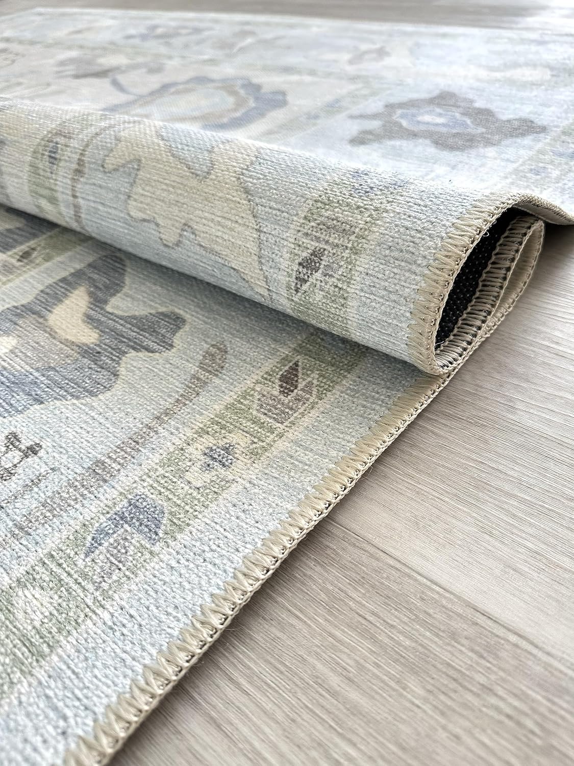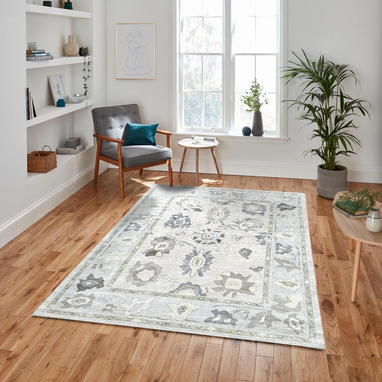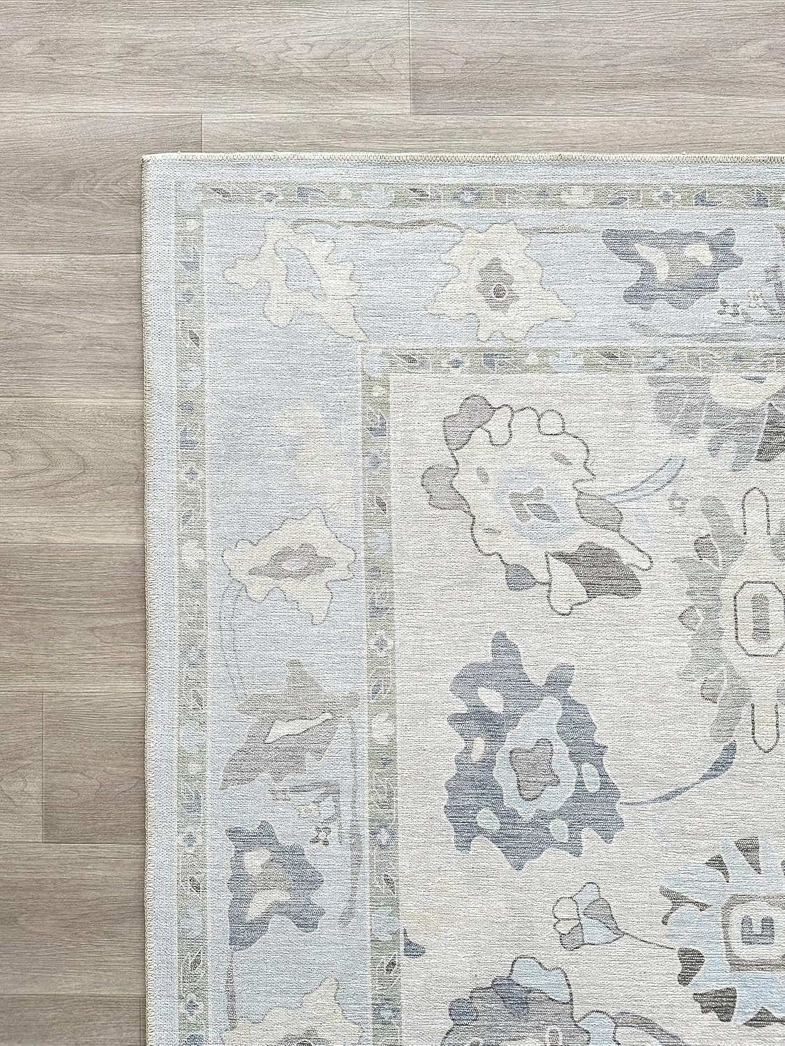 Cream Blue Oushak Rug, Modern, Vintage, Turkish, Eclectic, Floral, Pastel, Washable, Large Area Rugs for Living Room, Dining, Bedroom, Girls, Boys, 7'5"x9'8"