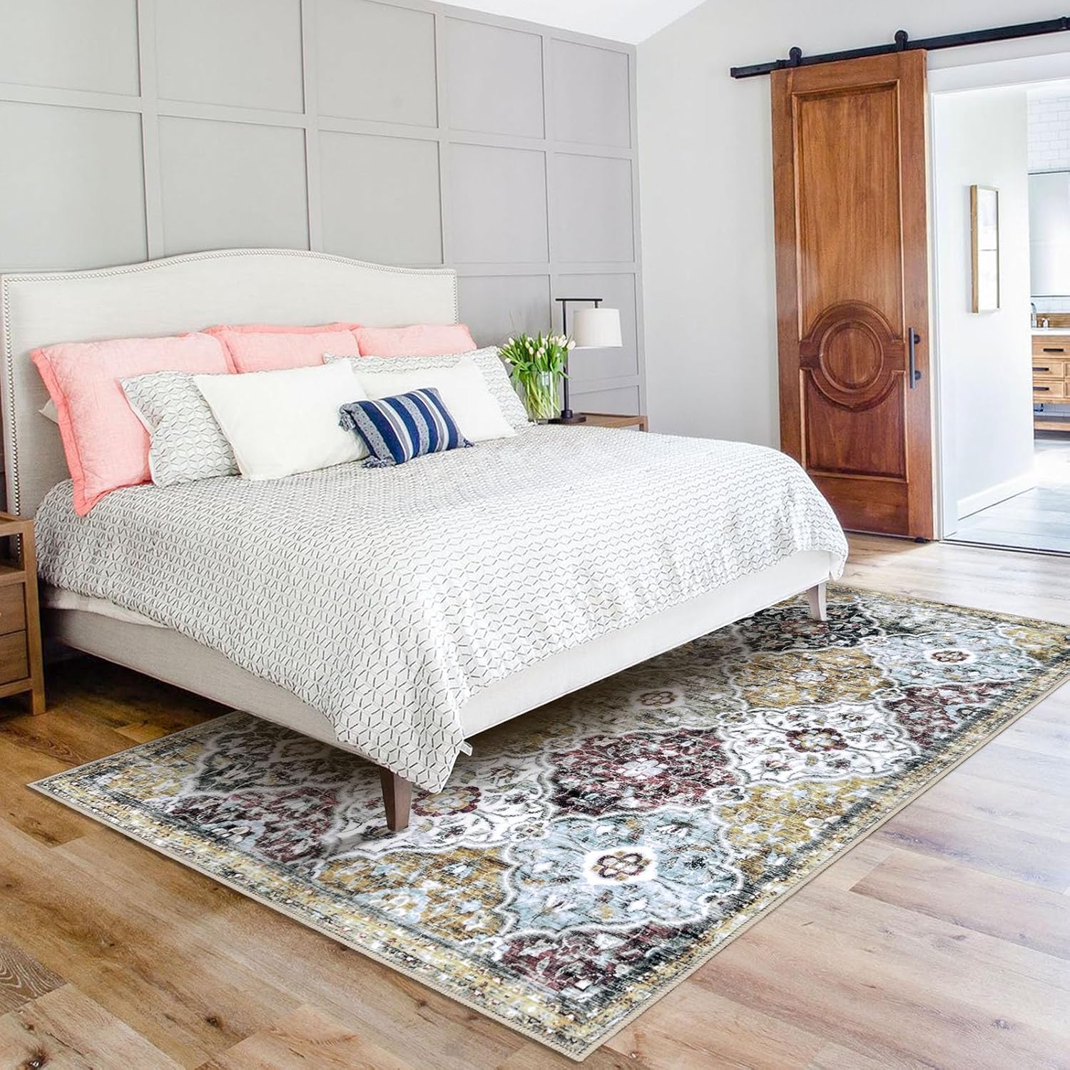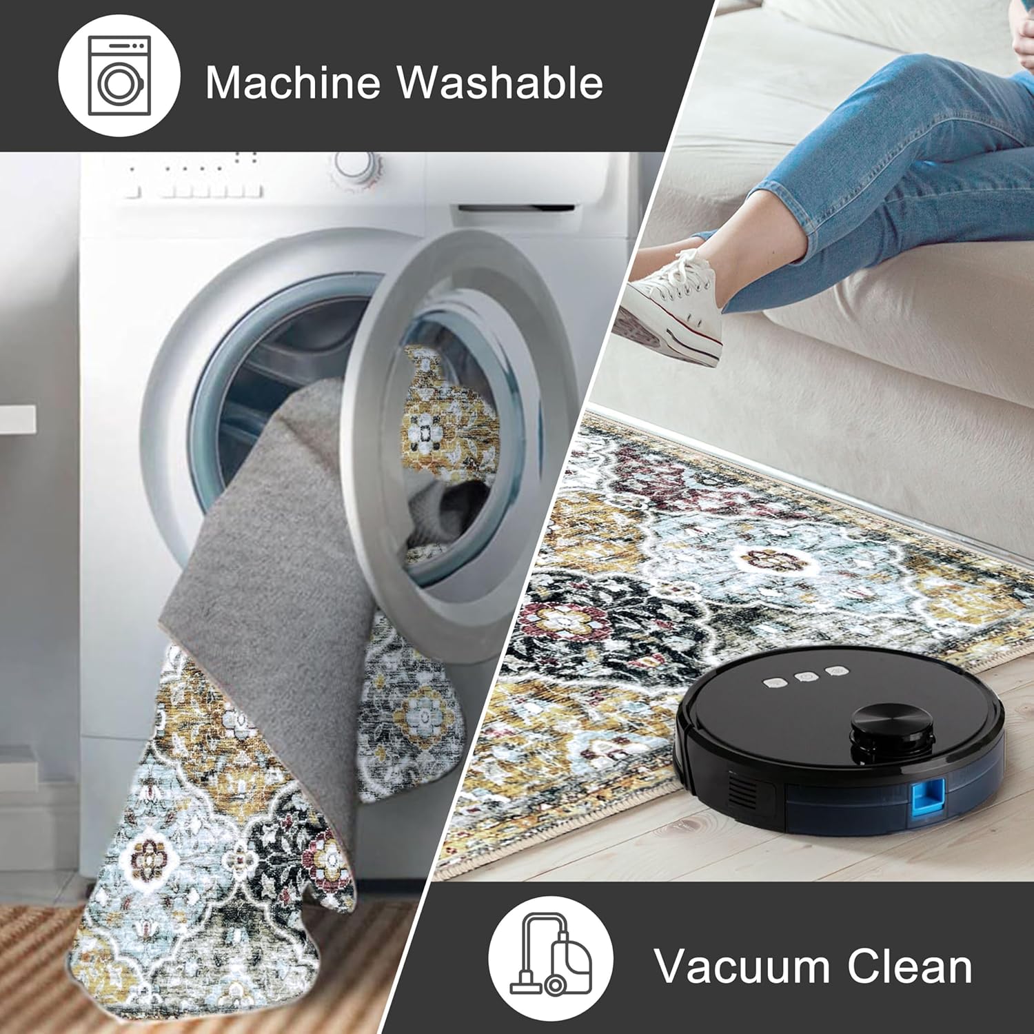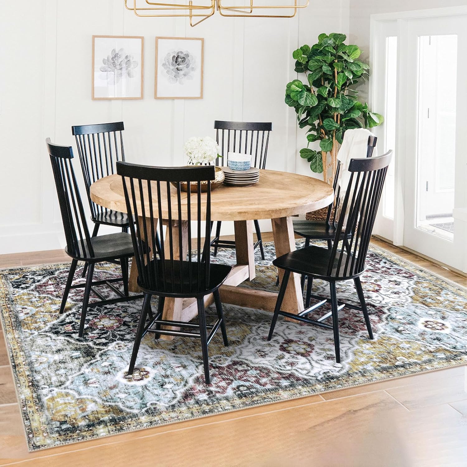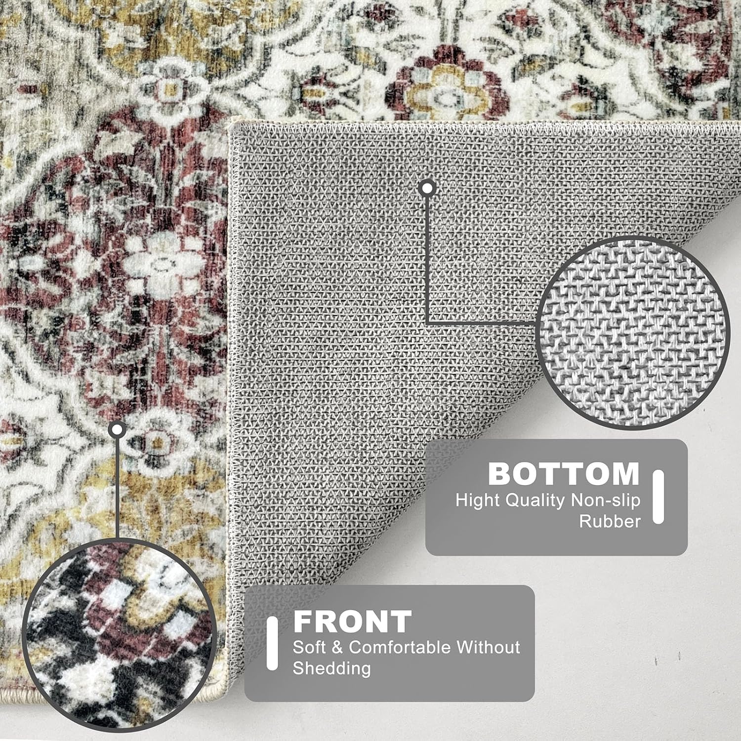 5x7 Area Rug, Moroccan Washable Living Room Rug, Vintage Rug Non-Slip, Large Print Faux Wool Throw Rug Indoor Kitchen Rug for Entryway Bathroom Bedroom Office Carpet, Cream/Multi