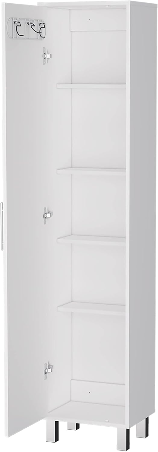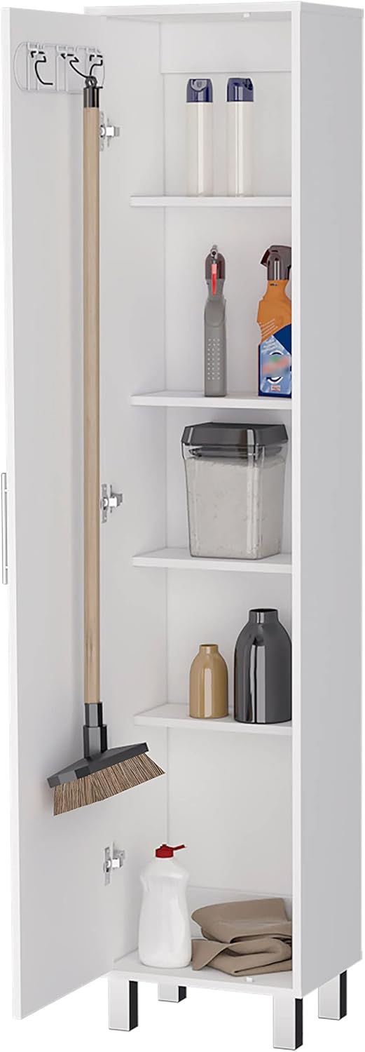 Lawen Tall Storage Cabinet, Single Door, 3 Broom Hangers,White -Kitchen
