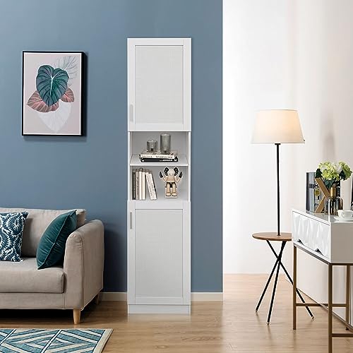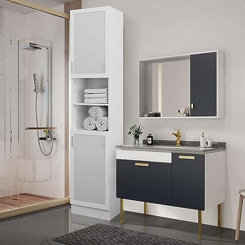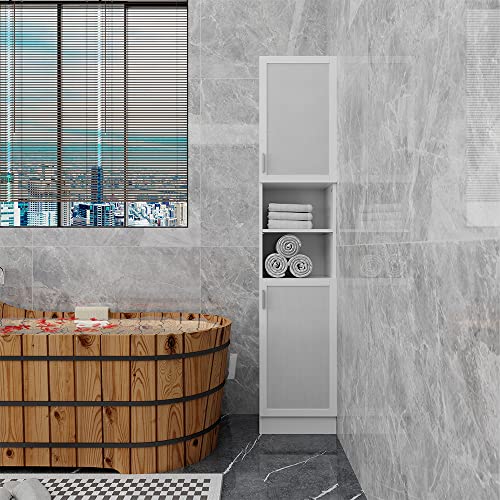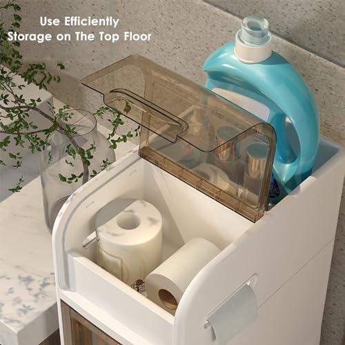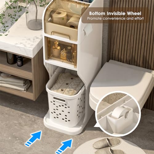 Slim Storage White Bathroom Unit Floor Storage Cabinet Tall Slim Corner Cupboard with Dirty Clothes Basket for Narrow Small Space (White)