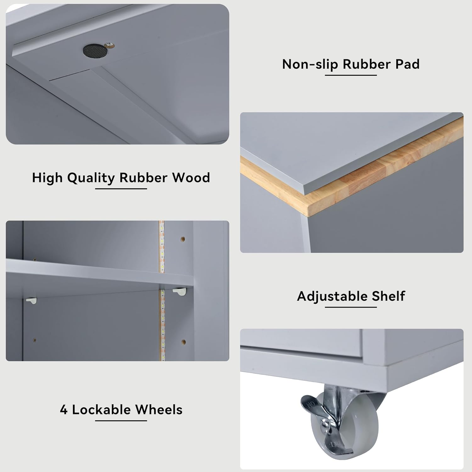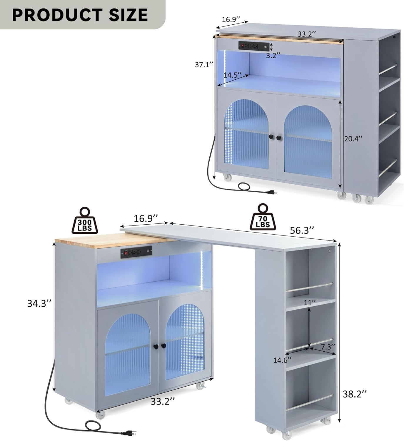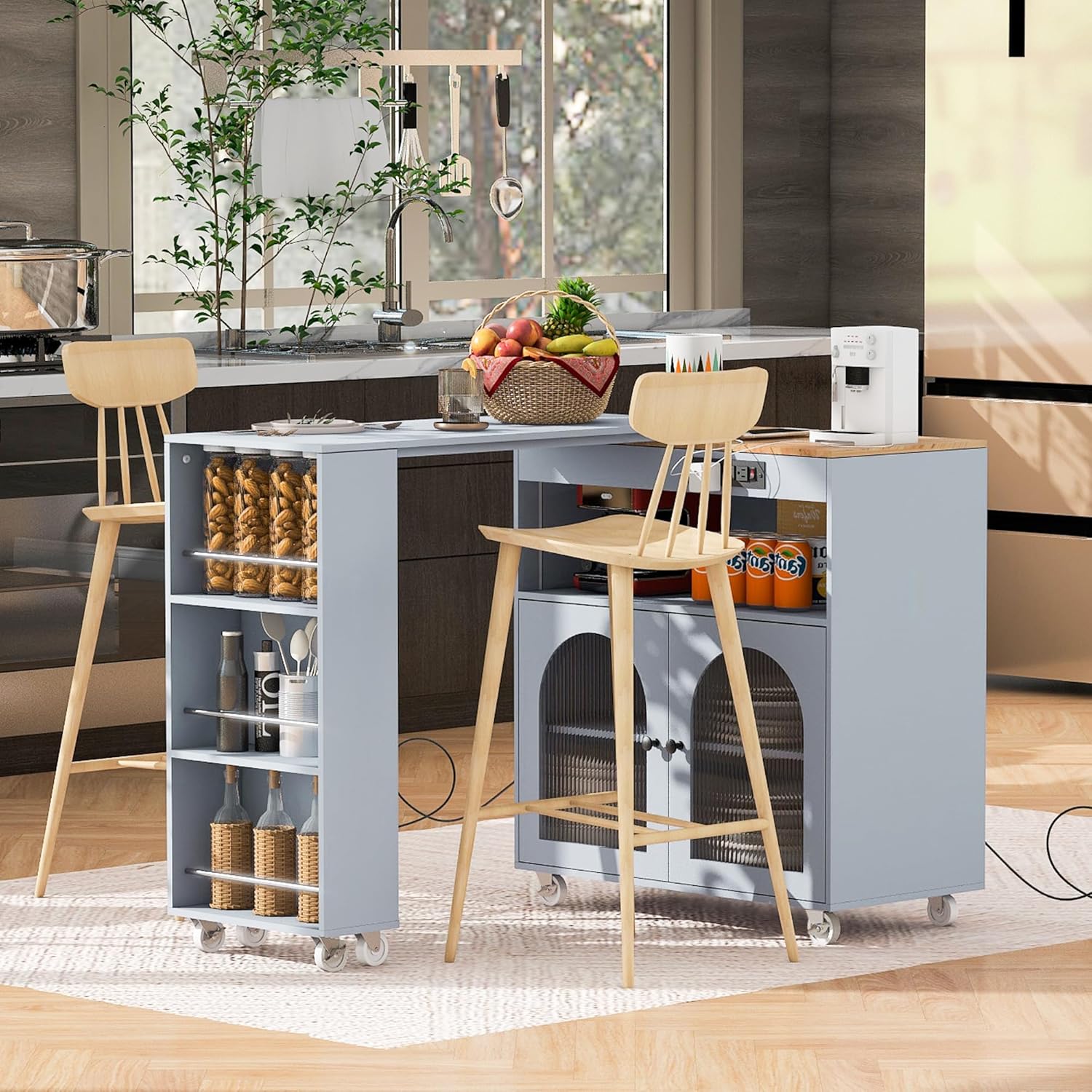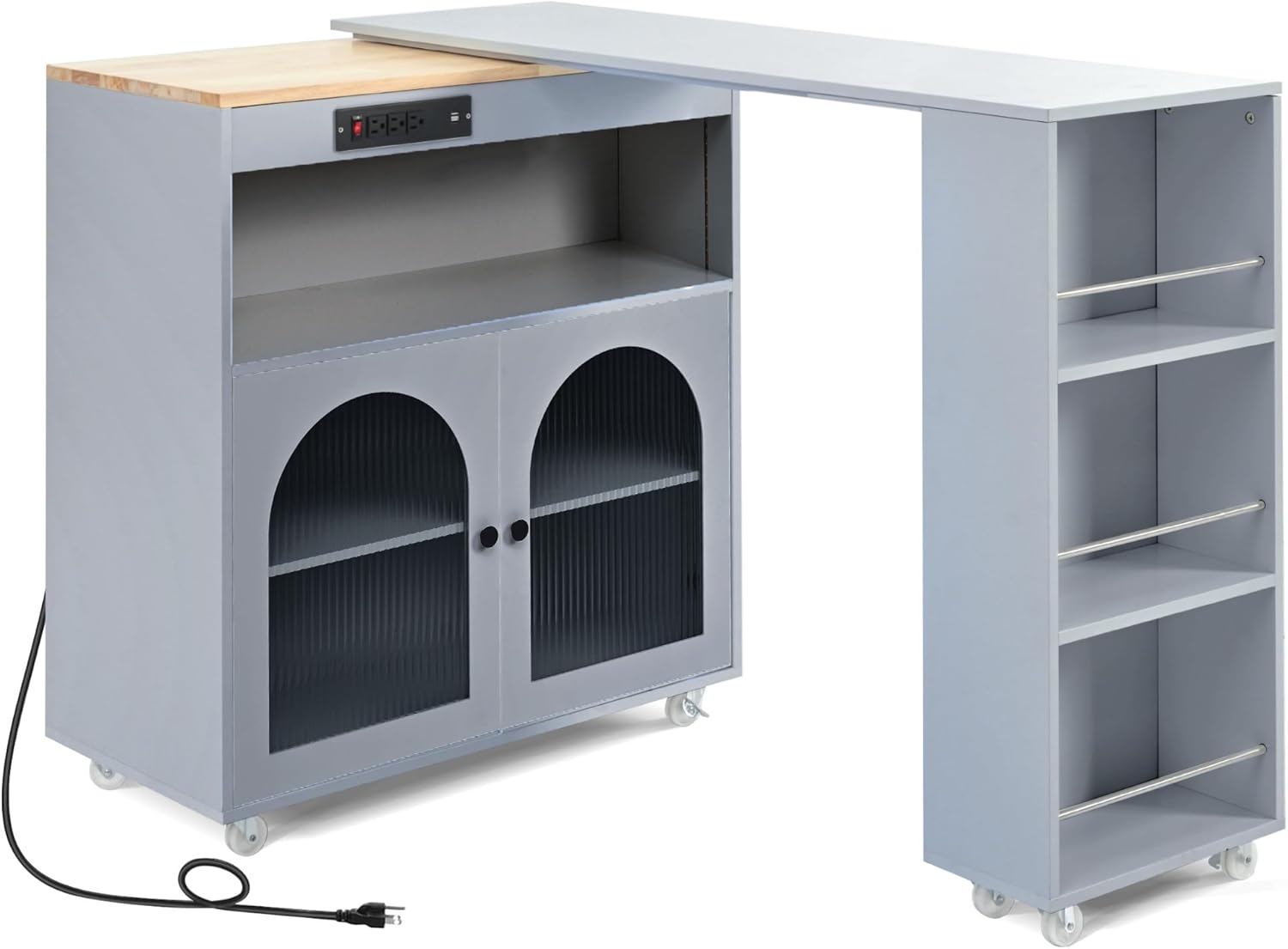 Merax Kitchen Island with Extended Table, Rolling Kitchen Islands Cart with LED Lights, Power Outlets, 2 Fluted Glass Doors, Storage Compartment, and Side 3 Open Shelves (Grey Blue)