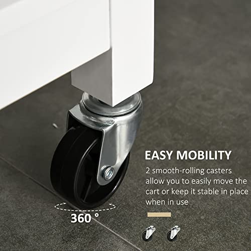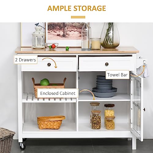 HOMCOM Rolling Kitchen Island with Storage, Kitchen Cart with Solid Wood Top, Glass Door Cabinet, Adjustable Shelf, Towel Rack, 2 Drawers for Dining Room, White