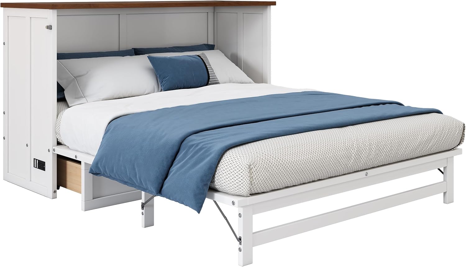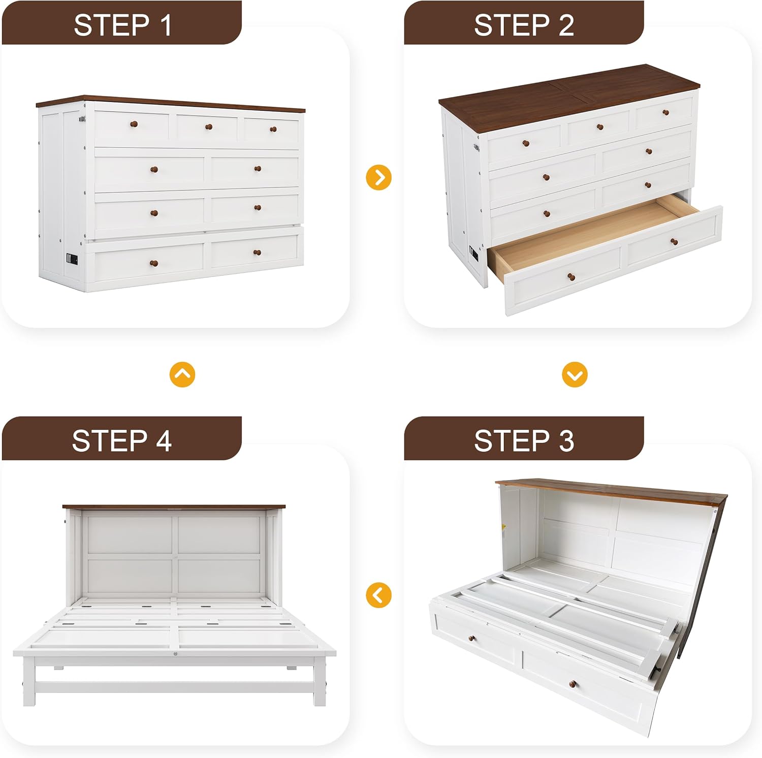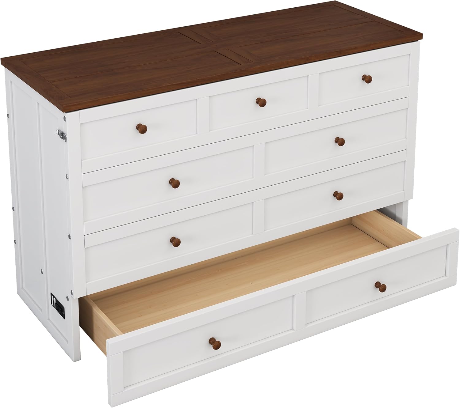 Full Size Murphy Bed Chest with Charging Station and Large Storage Drawer, Foldable Platform Bedframe for Home Office Small Room (White+Walnut)