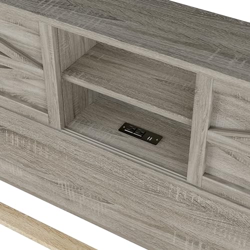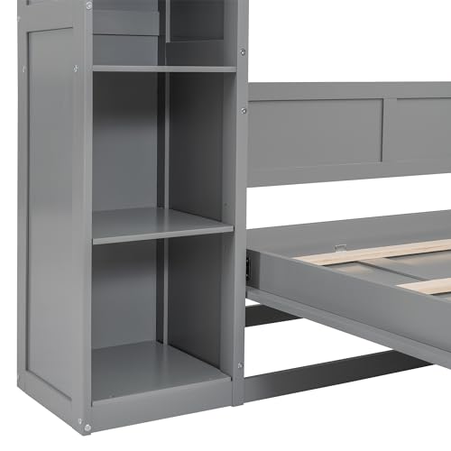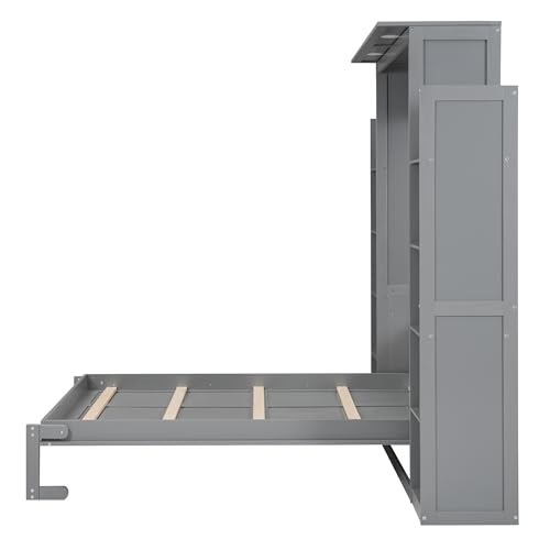 SOFTSEA Full Size Murphy Bed, Wall Bed with Shelves and LED Lights, Wood Bed Frame Murphy Bed for Bedroom Guestroom Small Room Living Room, Gray