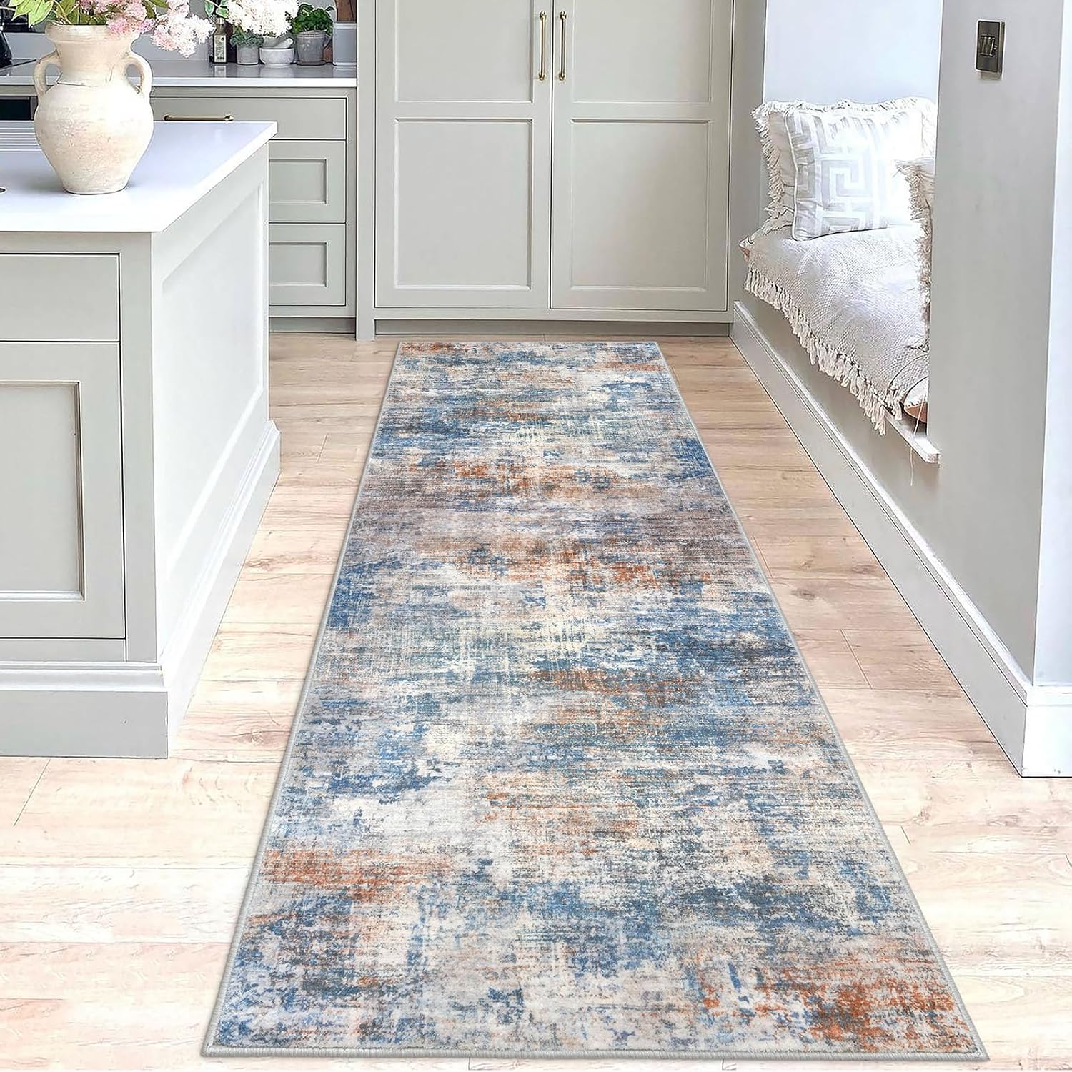 IOHOUZE Abstract Runner Rug 3x8 Ft Washable Runners for Hallways, Non Slip Kitchen Runner Soft Faux Wool Entryway Rug Runner Indoor, Modern Abstract Floor Carpet for Hall Bedroom, Blue Rust