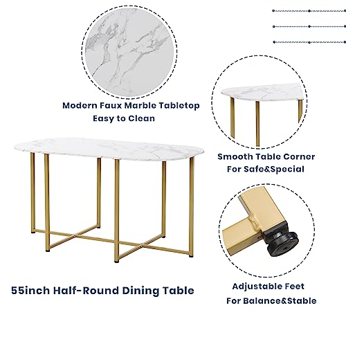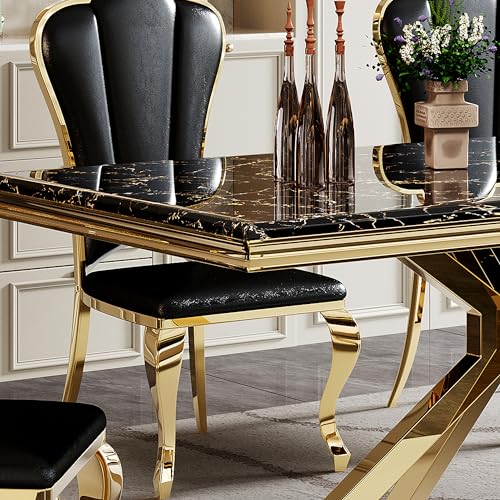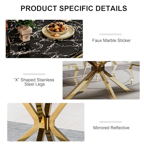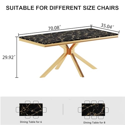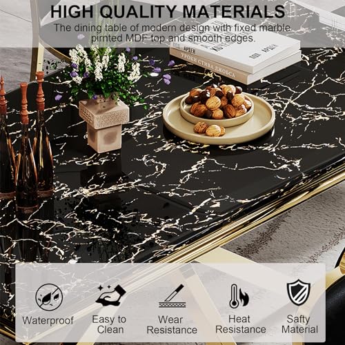 70" Faux Marble Dining Table for 6-8, Modern Black Marble Printed Dining Room Table with Cross Gold Mirror Finish Stainless Steel Base, Rectangular Dinner Tables for Dining Room Kitchen