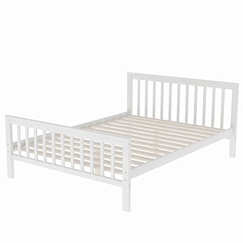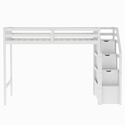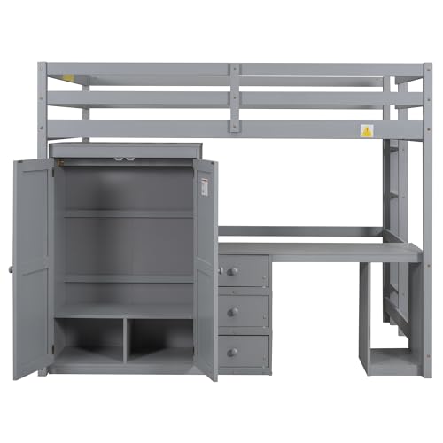 Full Size Loft Bed, Modern Loft Bed with Desk, Wardrobe and Storage Drawers, High Fence, Built-in Ladder, Space Saving, Wood Loft Bed for Bedroom Apartment Small Space (White)