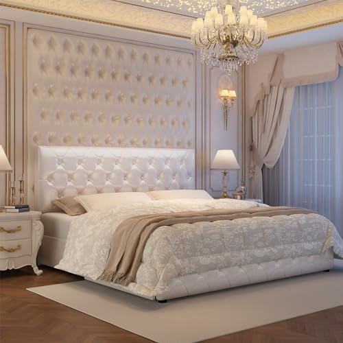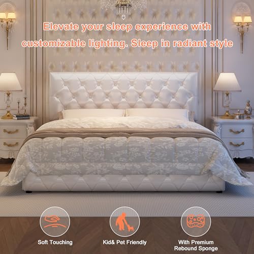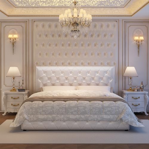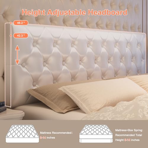Queen Bed Frame with 4 Drawers, Adjustable Upholstered Headboard Platform Bed, No Box Spring Needed, PU White