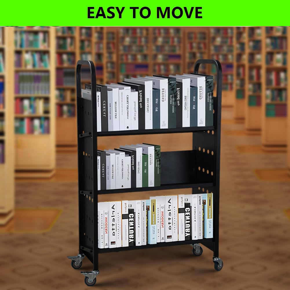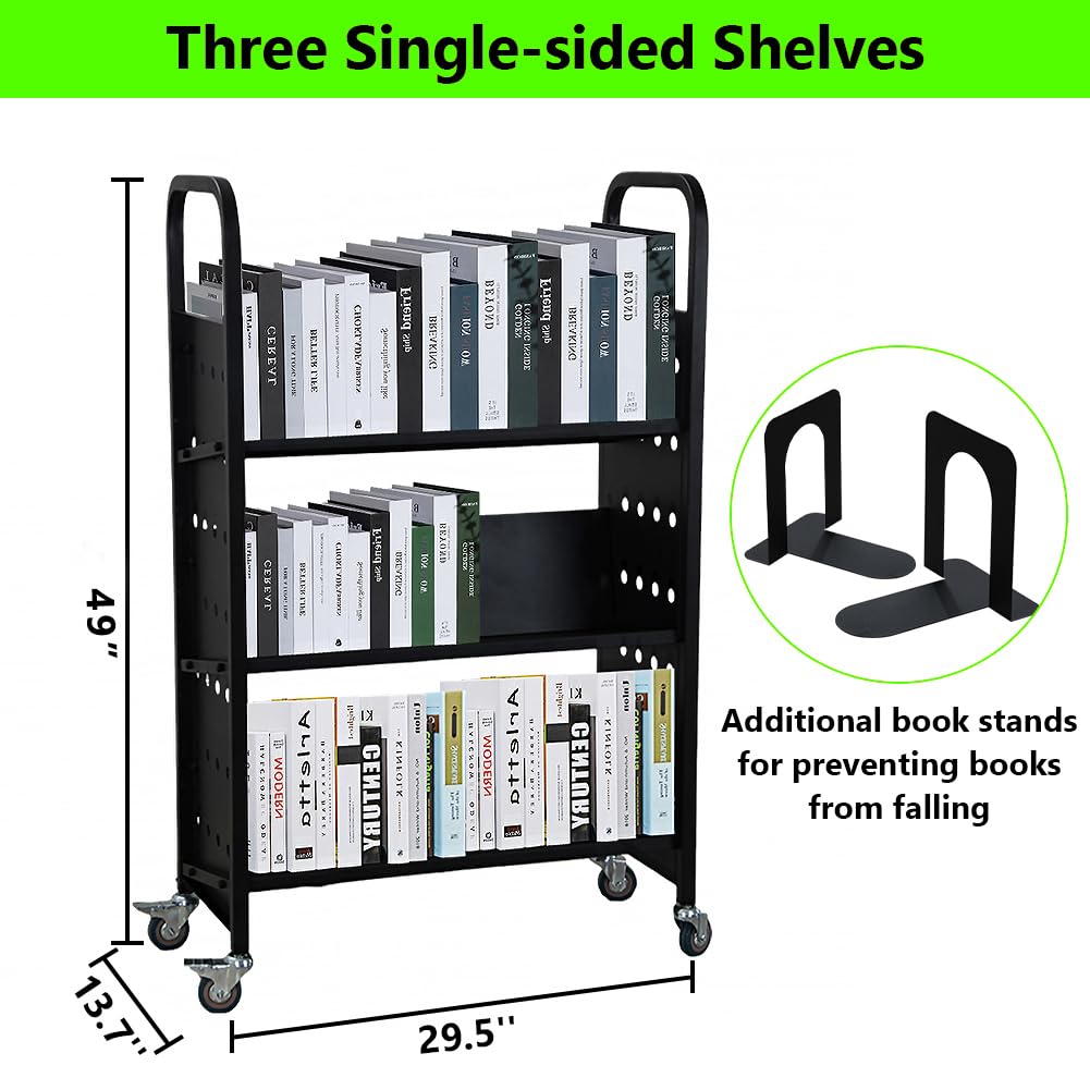 Book Cart, 46''x29.9''x12.9'' Rolling Library Cart, Single Sided V-Shaped Sloped Shelves with 4'' Lockable Wheels for Home Shelves Office School Book Truck, Quick Installation (Black)