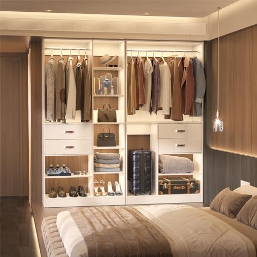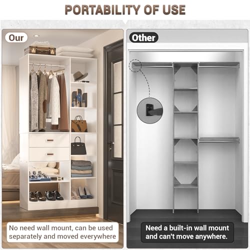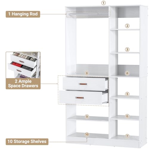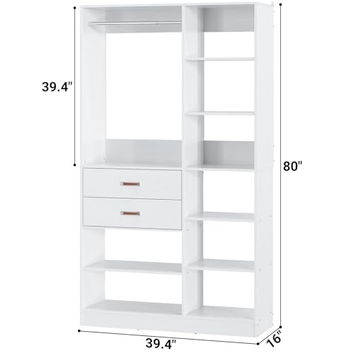 armocity Freestanding Closet System, 40 Inches Stand-Alone Wardrobe with 10 Shelves, 80'' Height Adjustable Cloth Garment Rack with 2 Wood Drawers, Wood Walk-in Closet with Hanging Rod, White