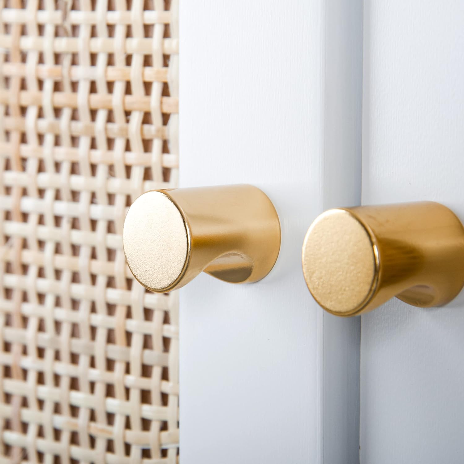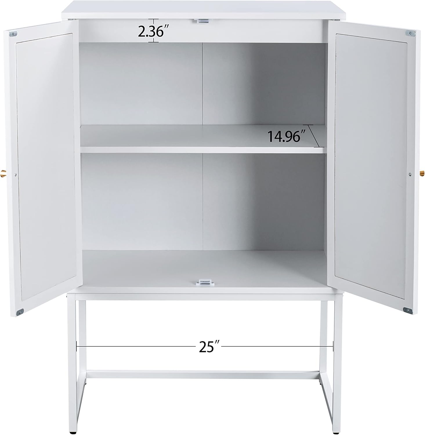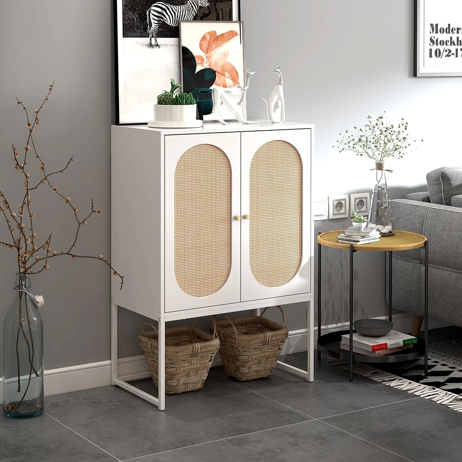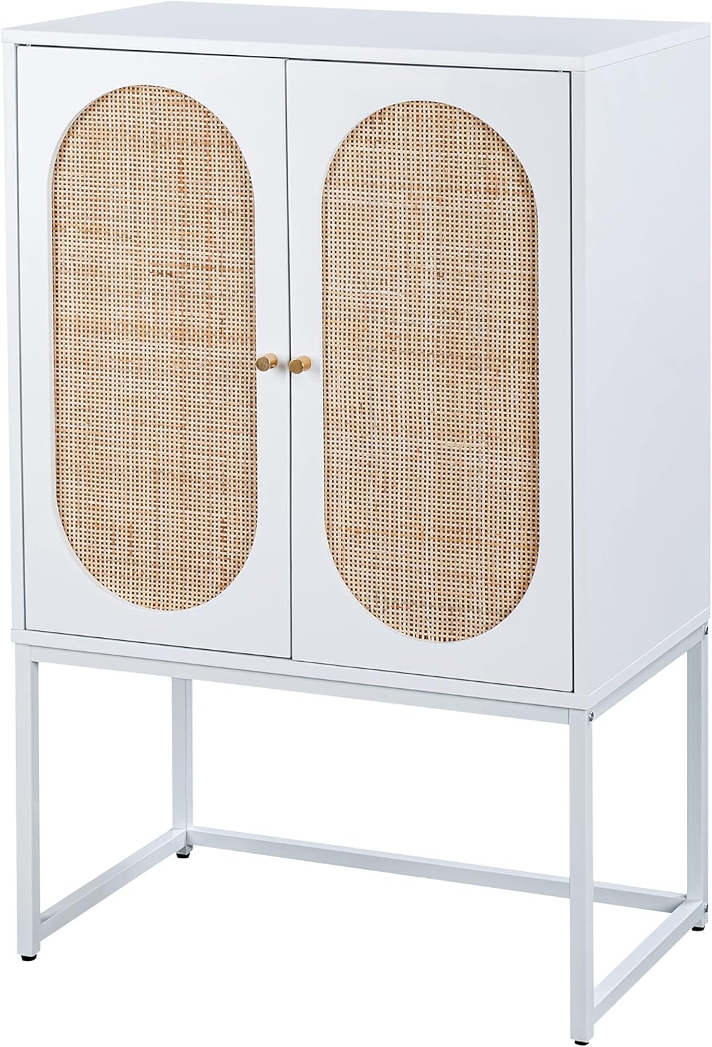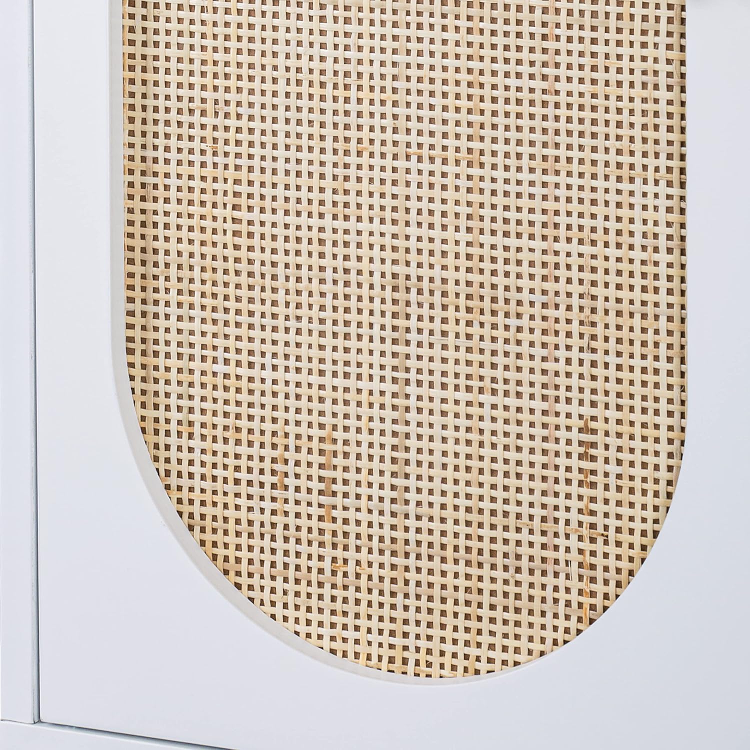 White Sideboard Buffet Accent Cabinet with Natural Rattan and 2 Magnetic Door, High Cabinet, 2-Tier Storage Cabinet with Metal Bracket, for Living Room Bedroom Dining Room (White)