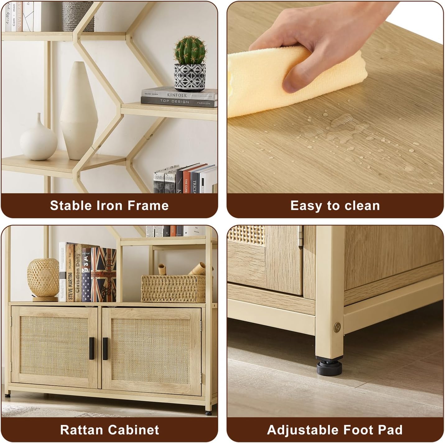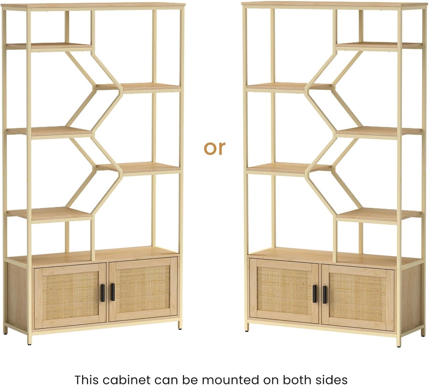 ZeHuoGe Rattan Bookshelf with 2 Doors, 7 Tiers Bookcases Rack with Cabinet,Cane Storage Cabinet,Caning Furniture for Living Room Home Office