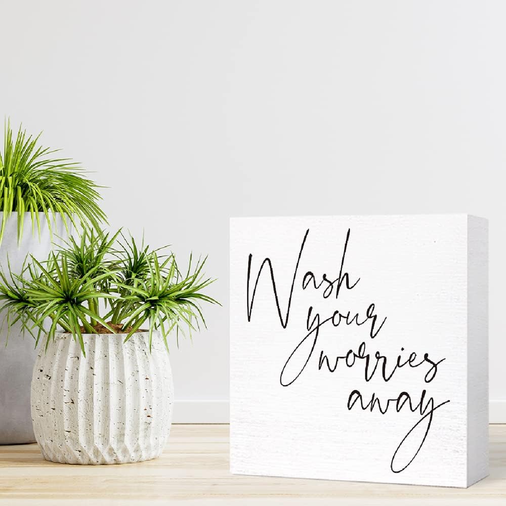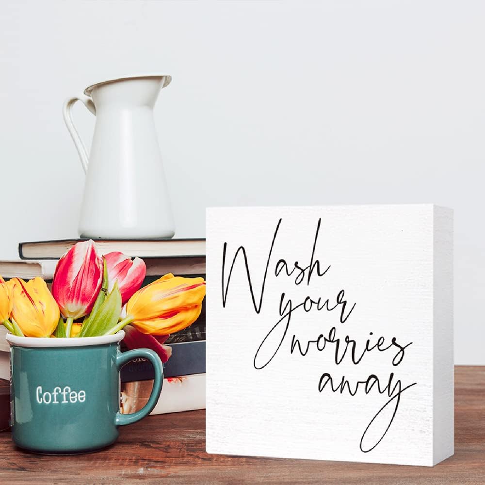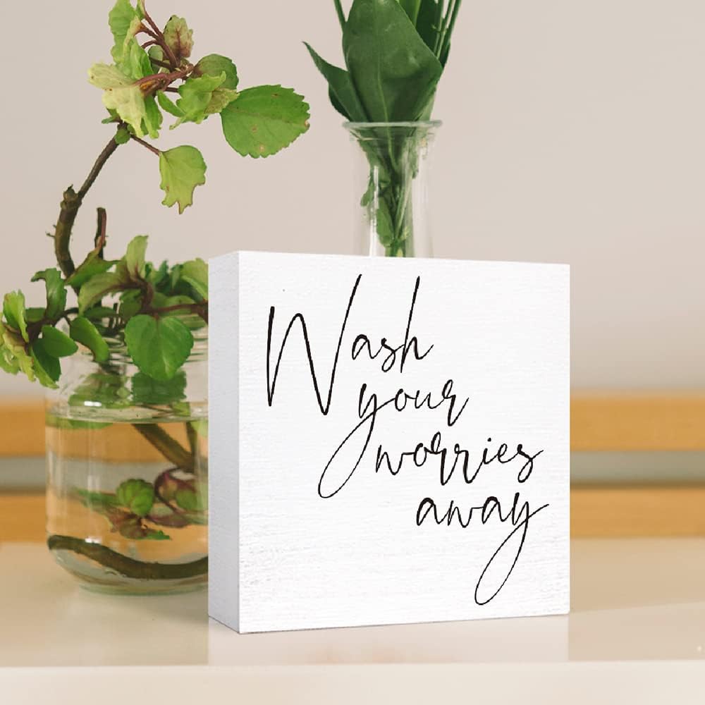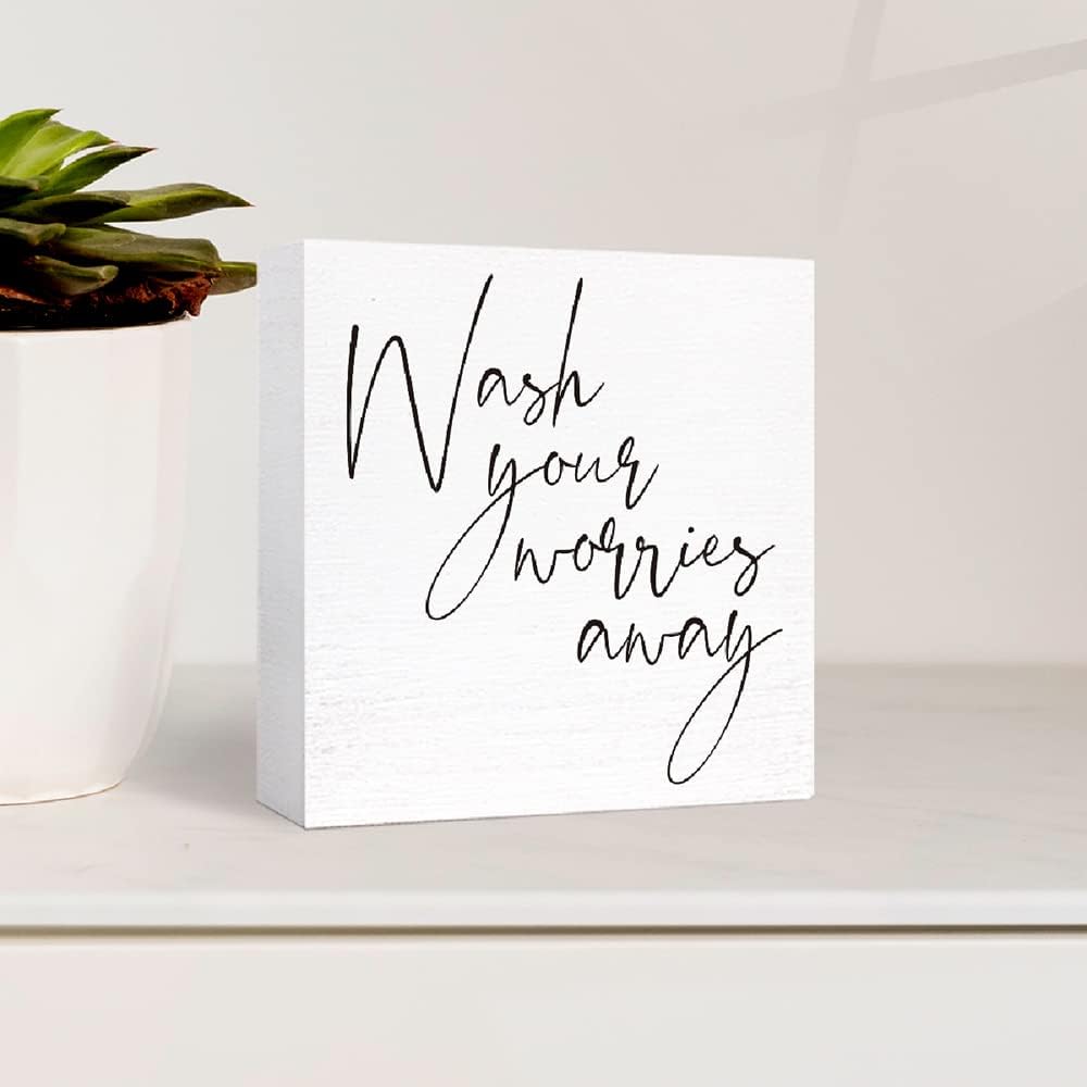 Funny Bathroom Wood Sign Wash Your Worries Away Wood Block Sign for Bathroom Shelf Toilet Restroom Home Tabletop Desk Decor,Farmhouse Bathroom Wooden Box Sign