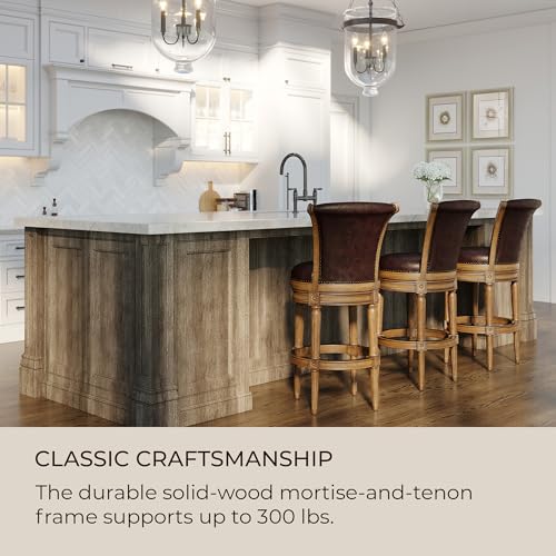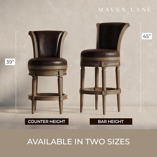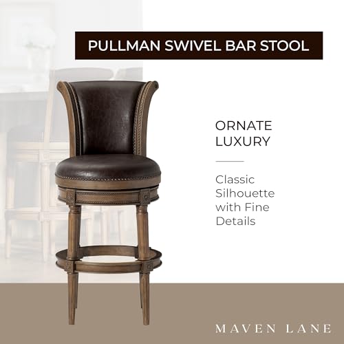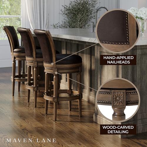 Maven Lane Pullman 31 Inch Tall Bar Height Upholstered Barstool with Back in Walnut Finish with Marksman Saddle Vegan Leather Cushion Seat, Set of 3