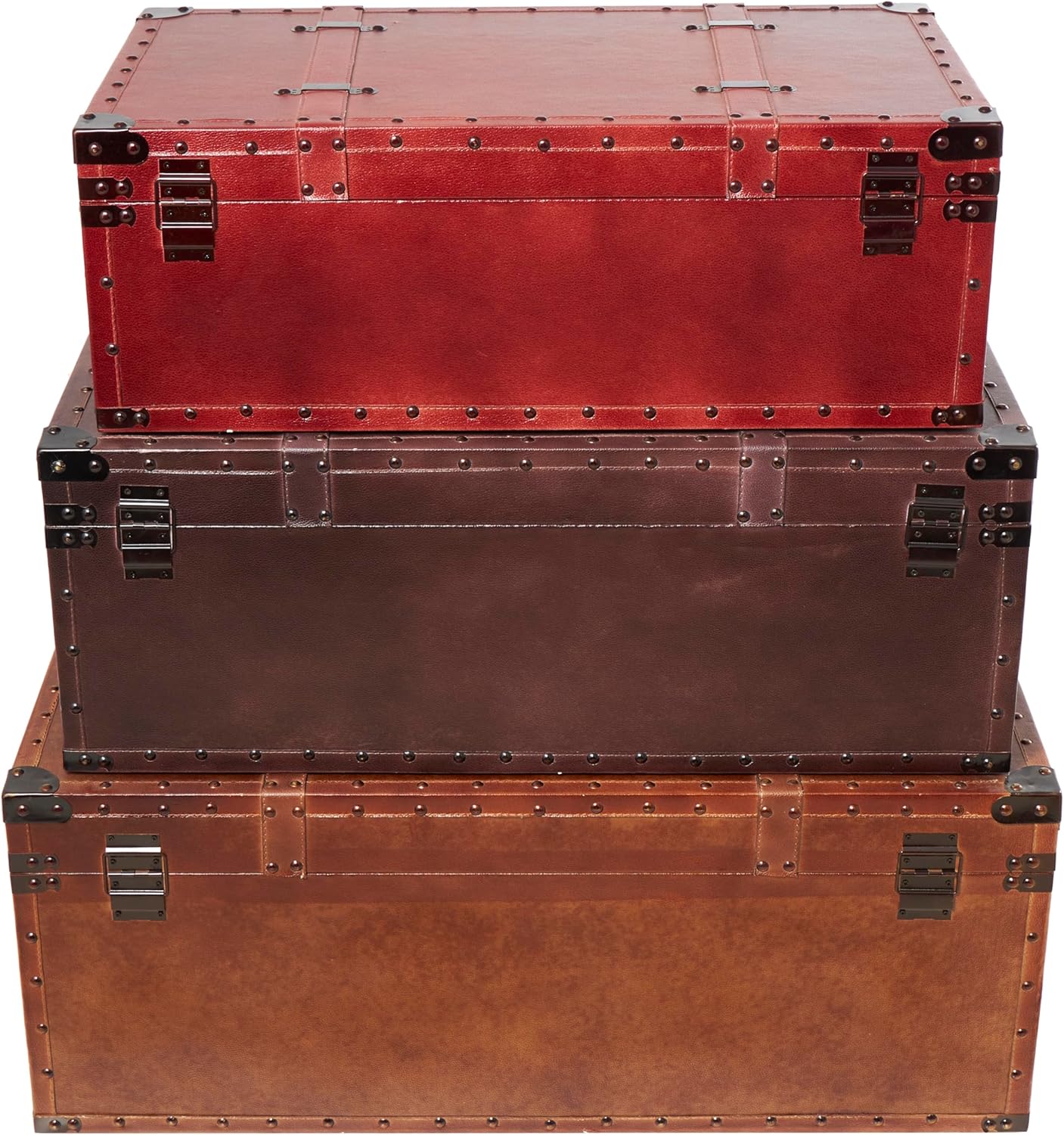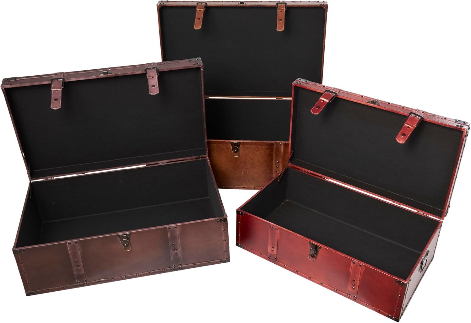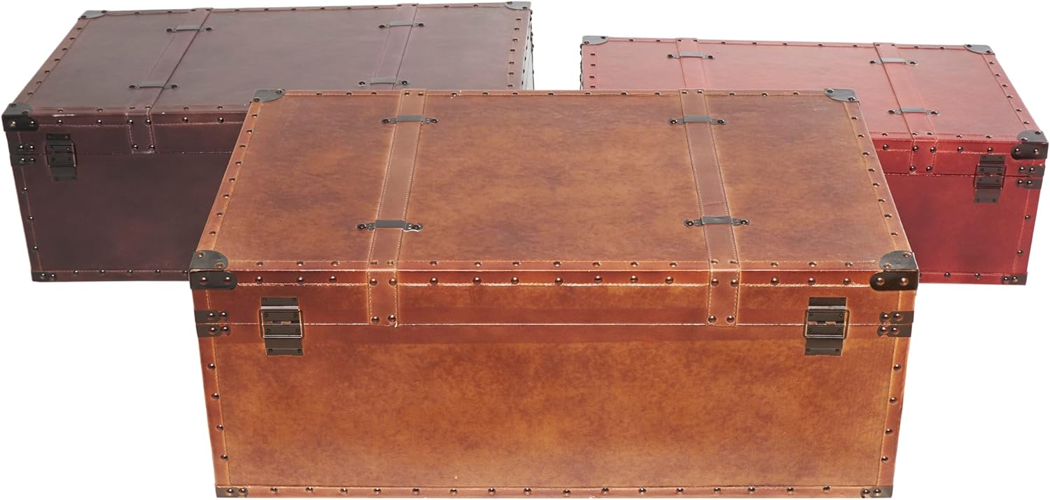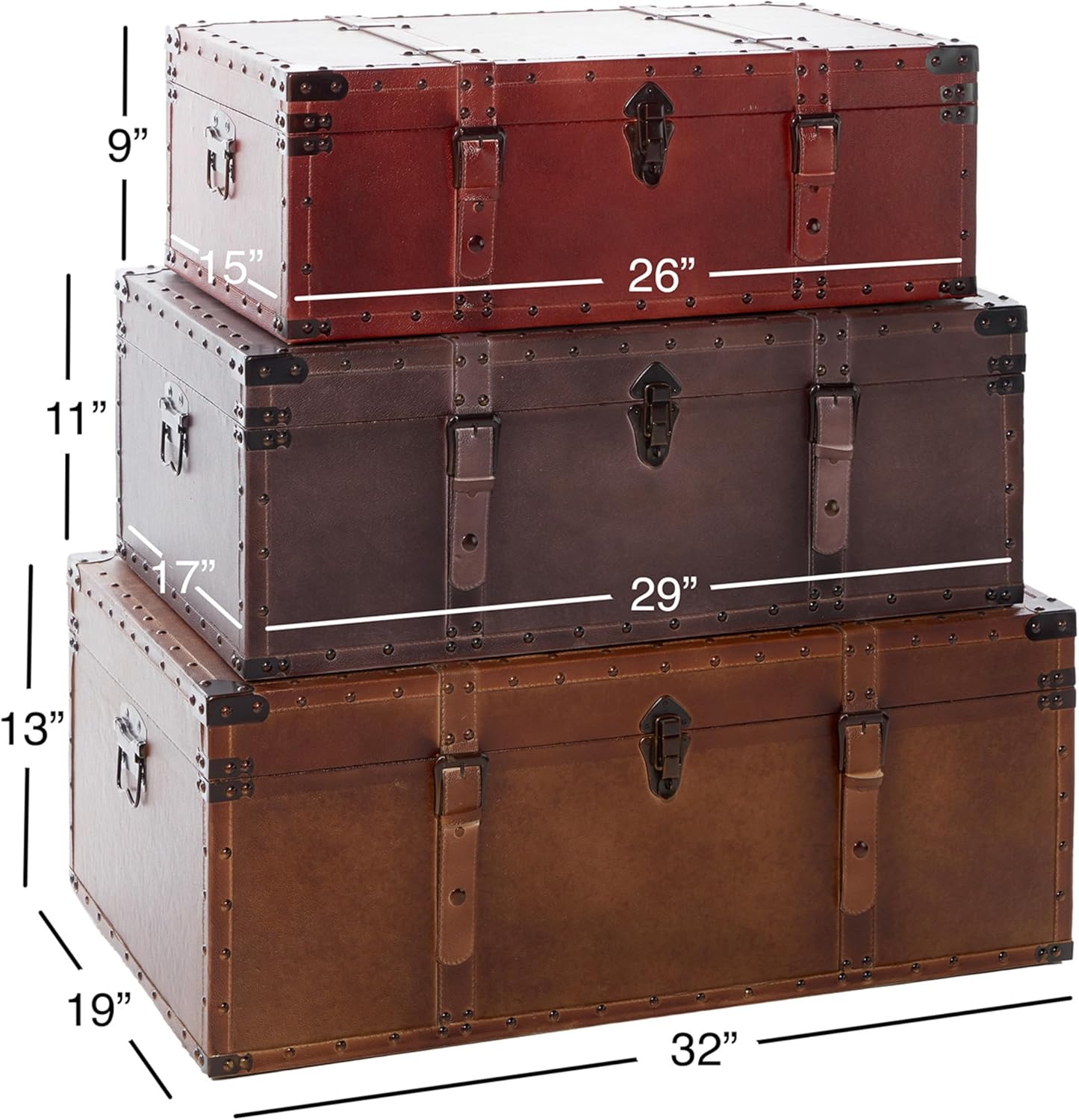 Deco 79 Wood Decorative Trunk Nesting Upholstered Decorative Large Boxes with Vintage Accents and Studs, Set of 3 Storage Trunks 32", 29", 26"W, Brown