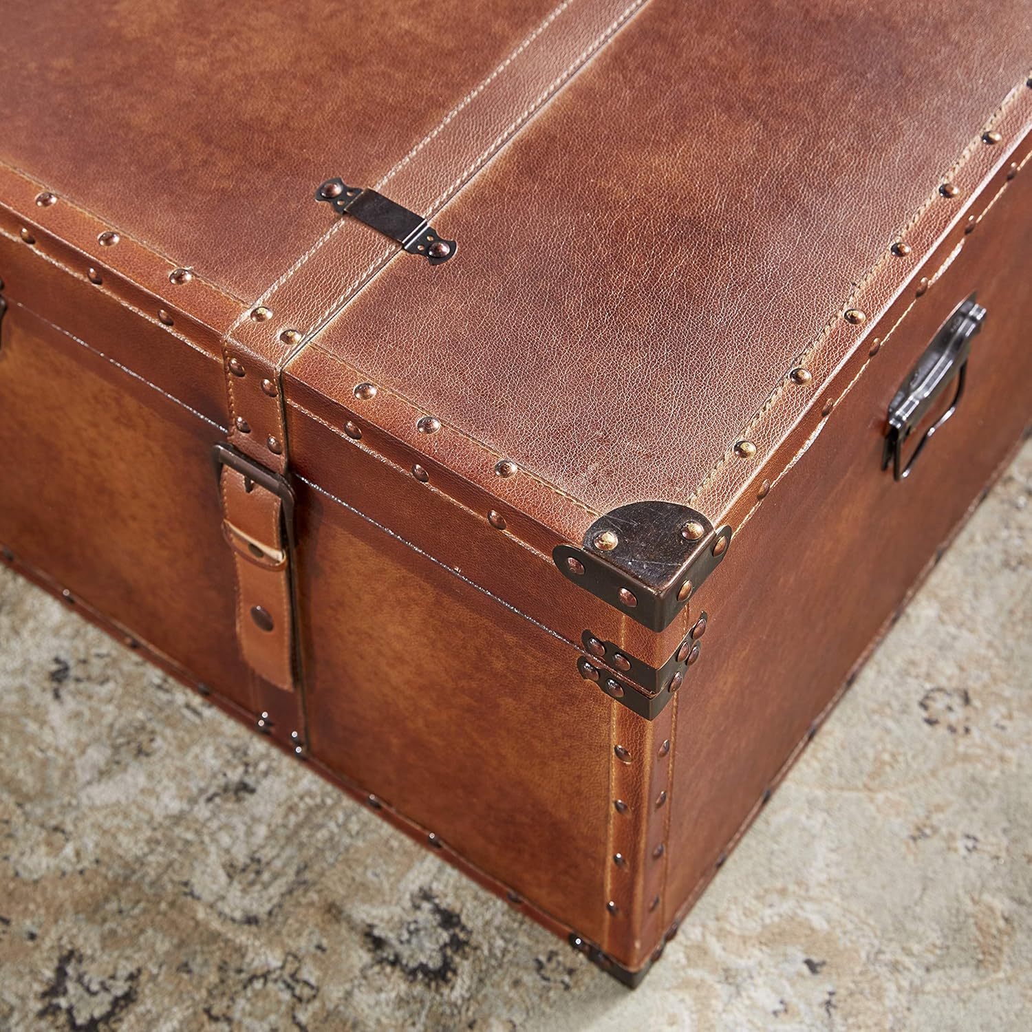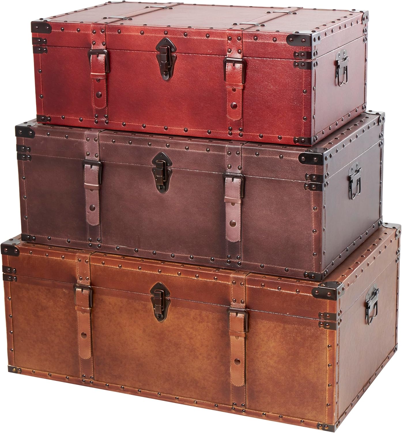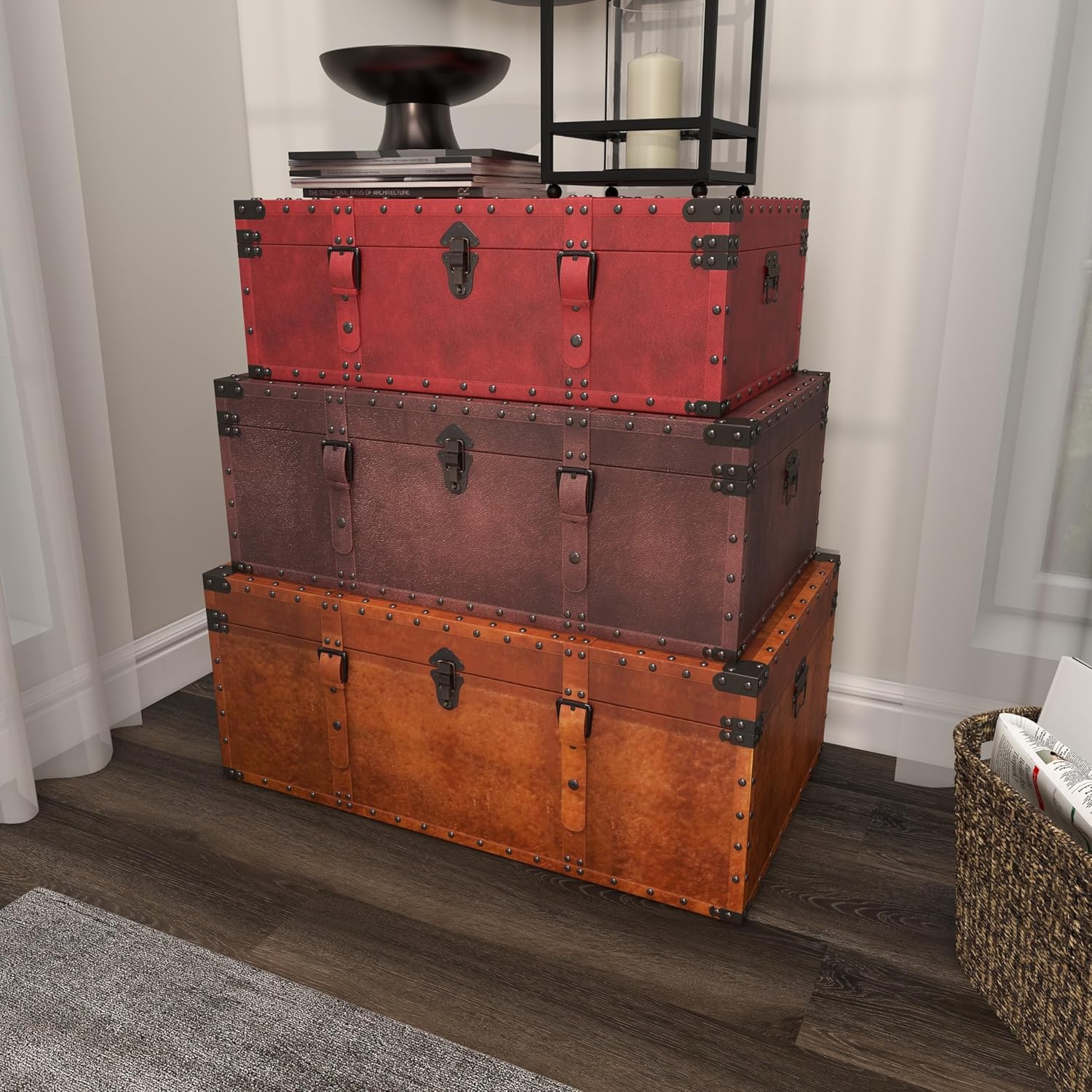 Deco 79 Wood Decorative Trunk Nesting Upholstered Decorative Large Boxes with Vintage Accents and Studs, Set of 3 Storage Trunks 32", 29", 26"W, Brown