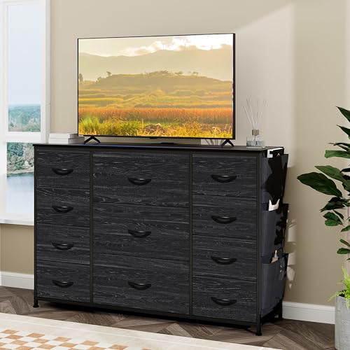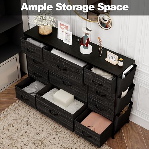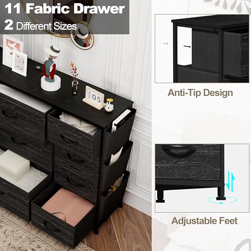 47" W Dresser for Bedroom Dresser Storage Organizer with 11 Drawers Chest of Drawers with Charging Station Long Fabric Dresser Drawers for Living Room Closet Entryway Bedroom (White)