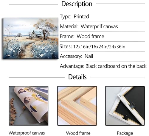 Framed Rustic Farmhouse Canvas Wall Art Beautiful Field Painting Wildflower Barn Print Nature Scenery Picture French Countryside Poster for Bathroom Bedroom Living Room Office Wall Decor 24x36in