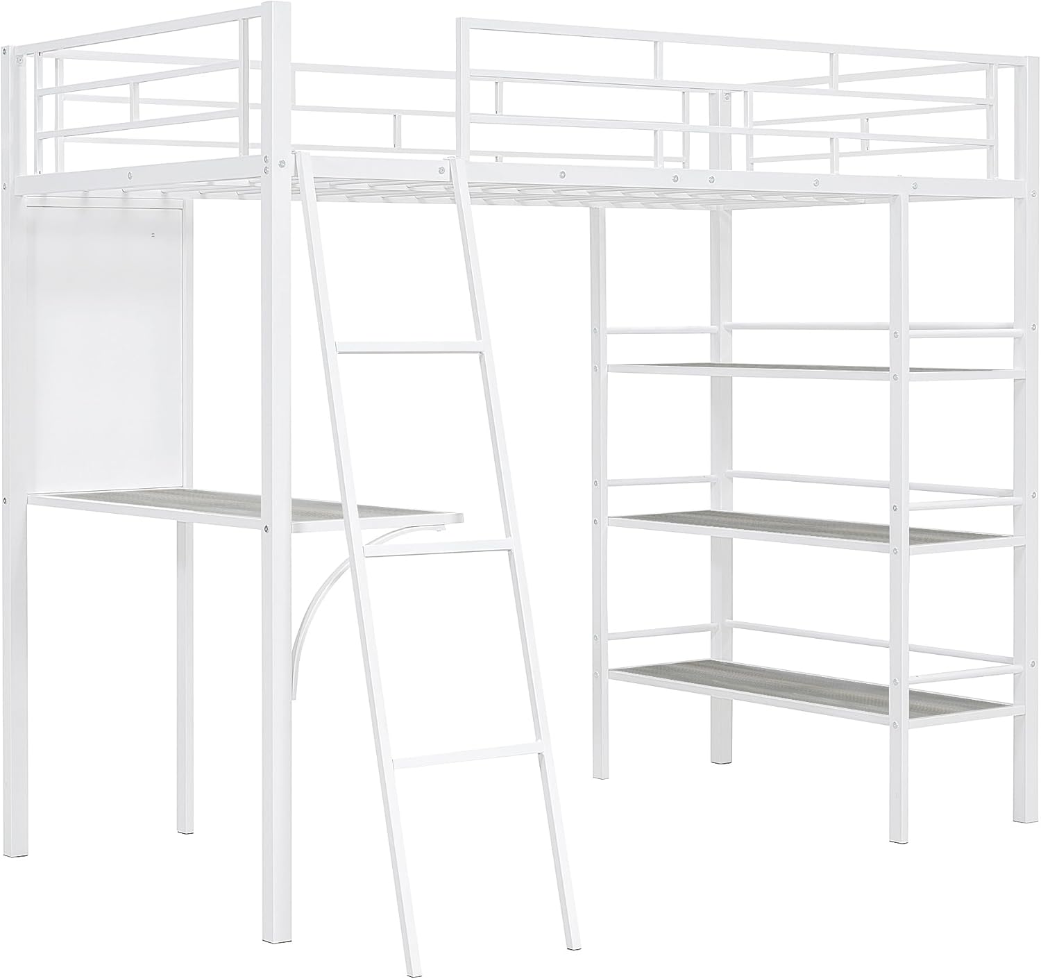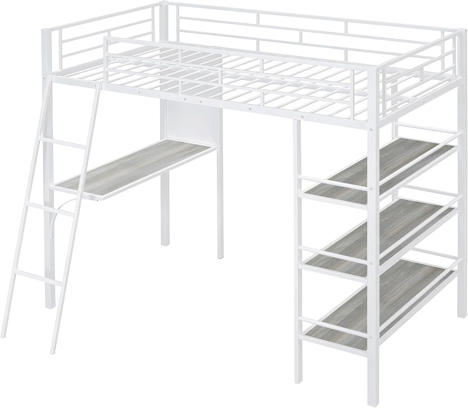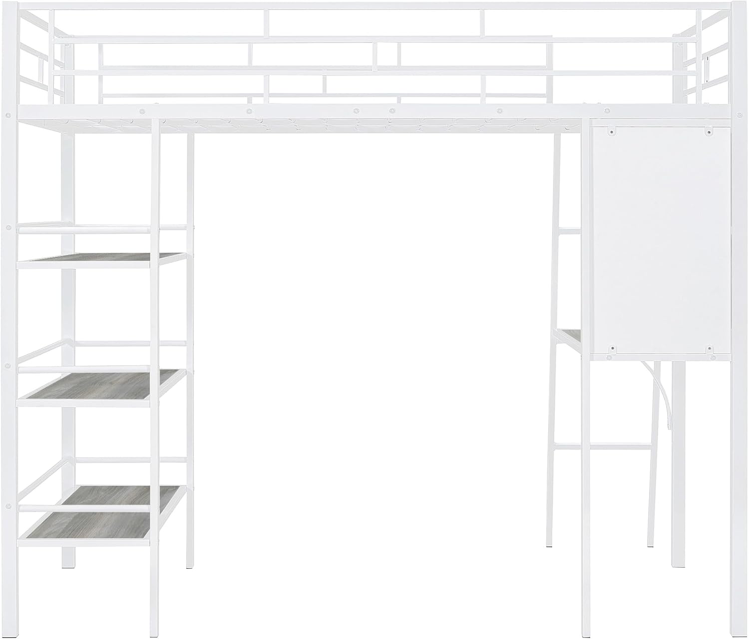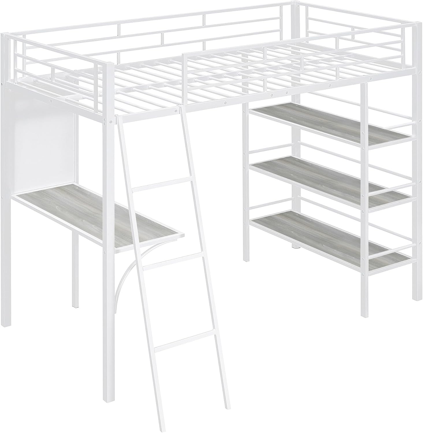 Twin Size Loft Bed Metal with Desk and Storage Shelves, with 3 Layers, Space Saving with Underneath and Whiteboard, High Loft Bed for Junior & Teens